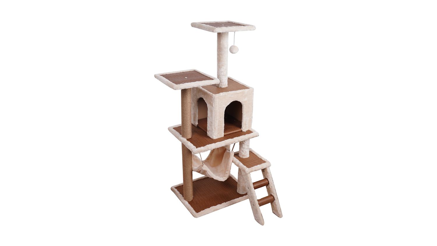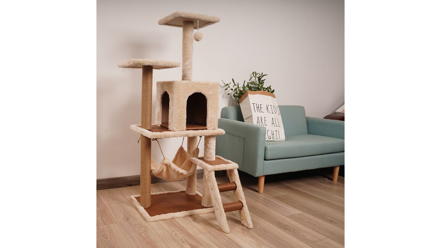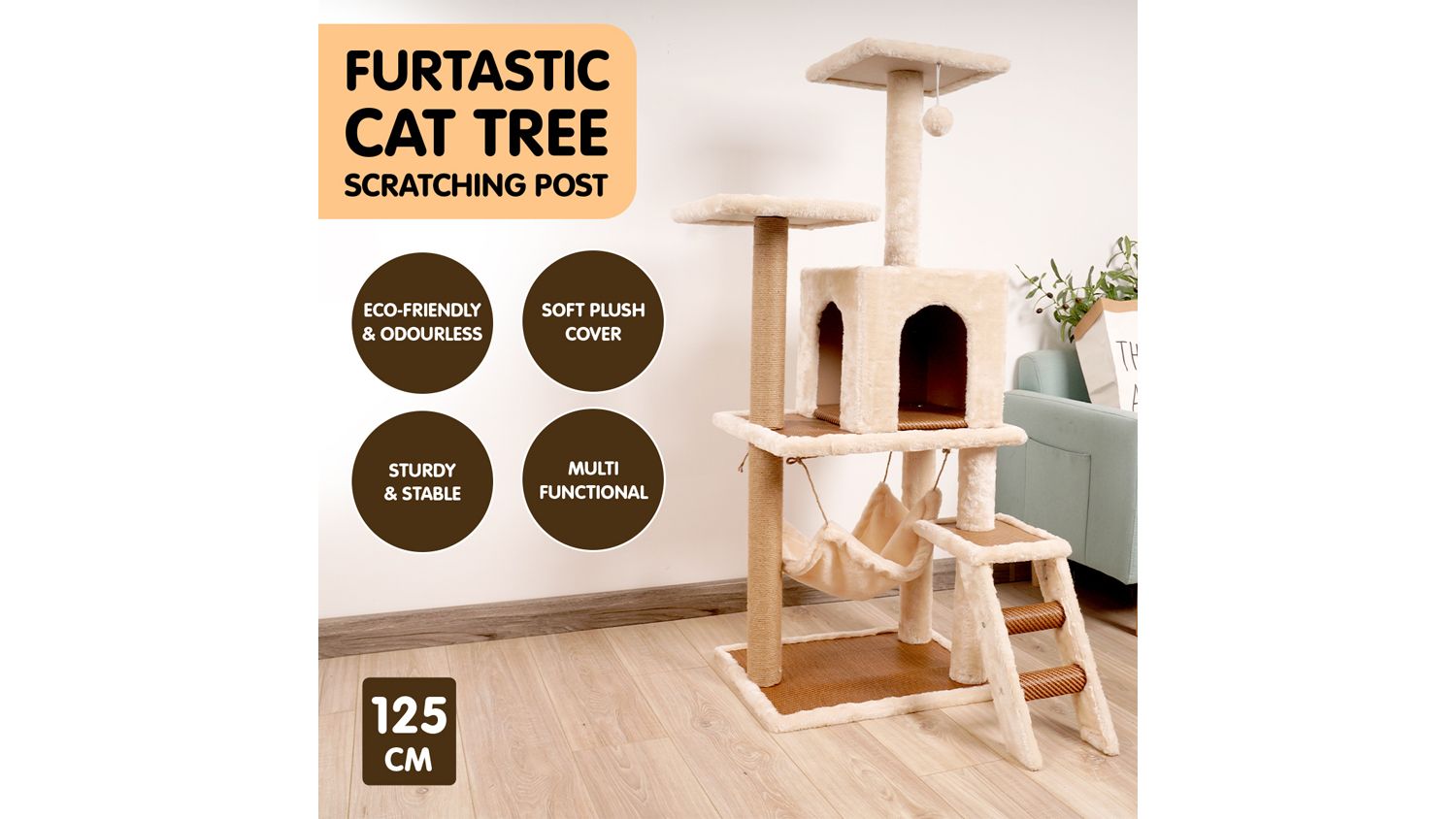 Provide a happy and cosy space for your paw-some pet with this Furtastic Cat Tree! Made from top-quality and eco-friendly materials, this cat condo is the perfect choice for your furry friend. It allows fun exploration since it features a cubby house, tunnel, ramp, dangling toy, built-in scratching post, hammock, and multiple storeys. Plus, it is covered with a stylish and comfy soft plush fabric, which is purr-fect for napping and lounging.