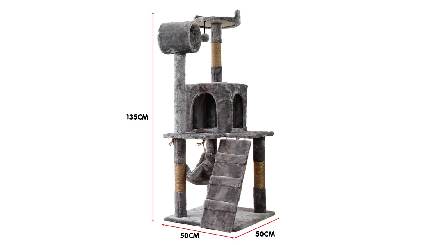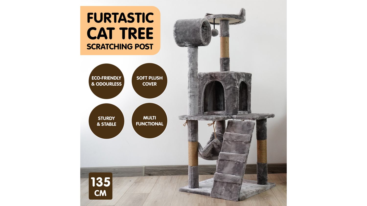 Provide a happy and cosy space for your paw-some pet with this Furtastic Cat Tree 135cm! Made from top-quality and eco-friendly materials, this cat condo is the perfect choice for your furry friend. It allows fun exploration since it features a cubby house, tunnel, ramp, dangling toy, built-in scratching post, hammock, and multiple storeys. Plus, it is covered with a stylish and comfy soft plush fabric, which is purr-fect for napping and lounging.