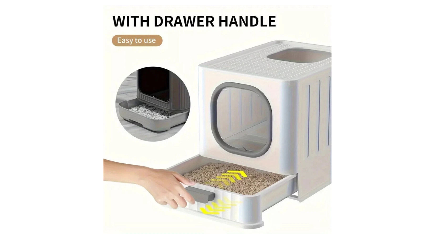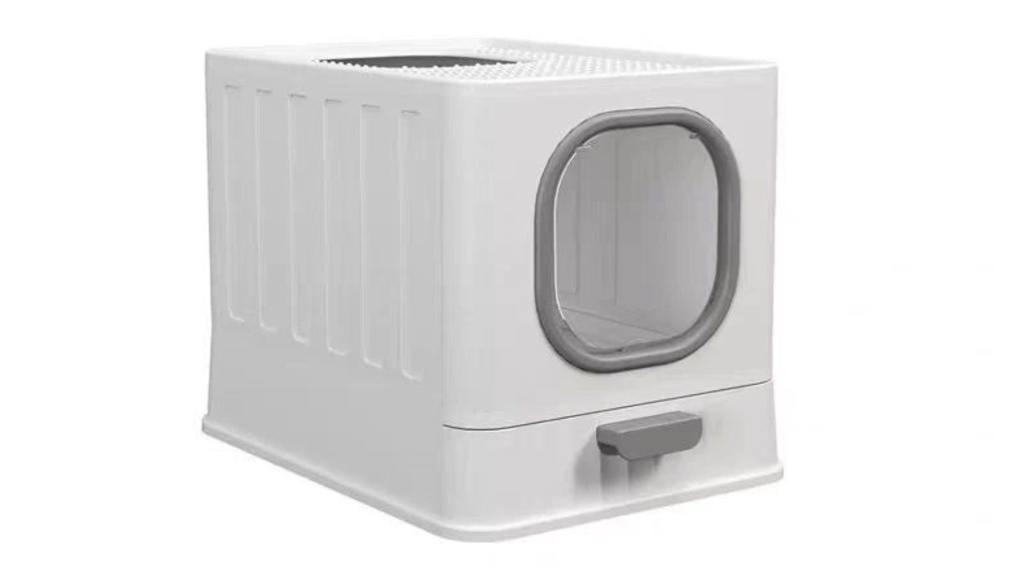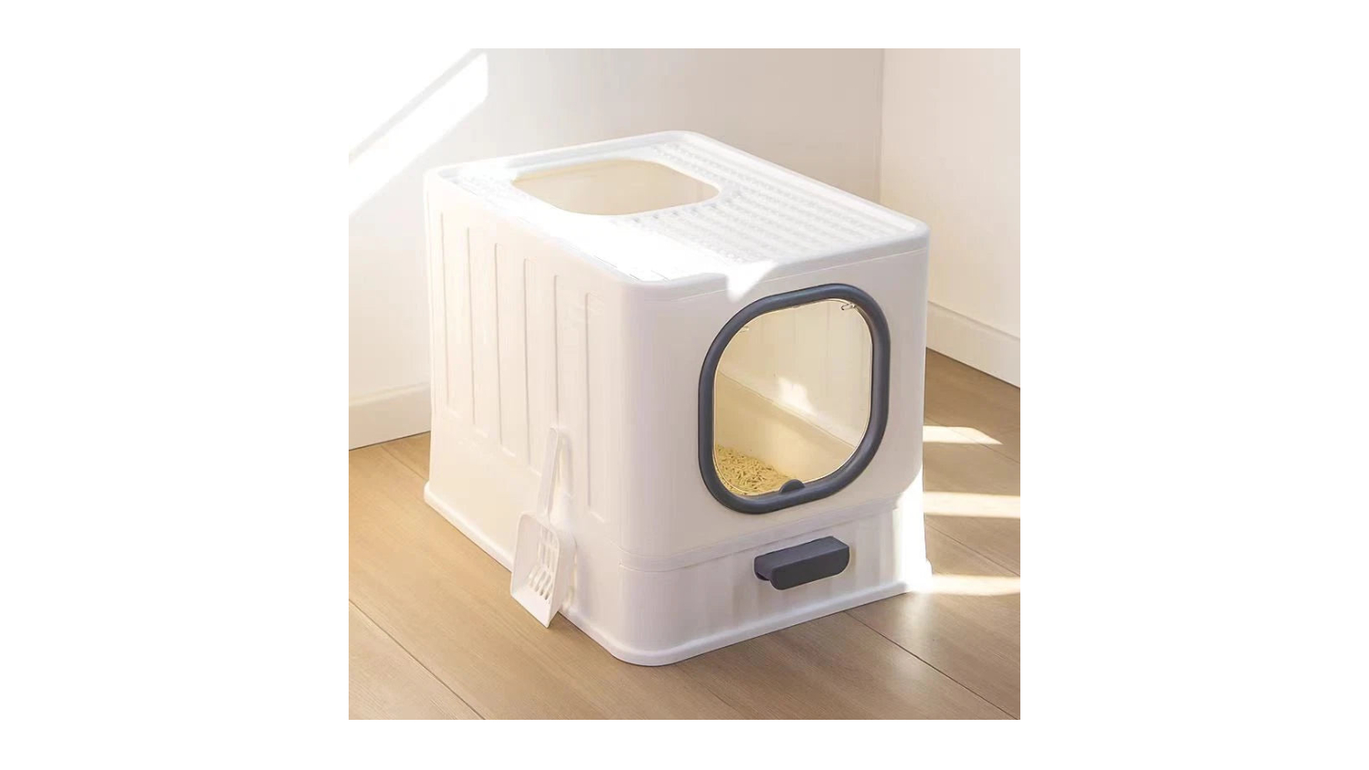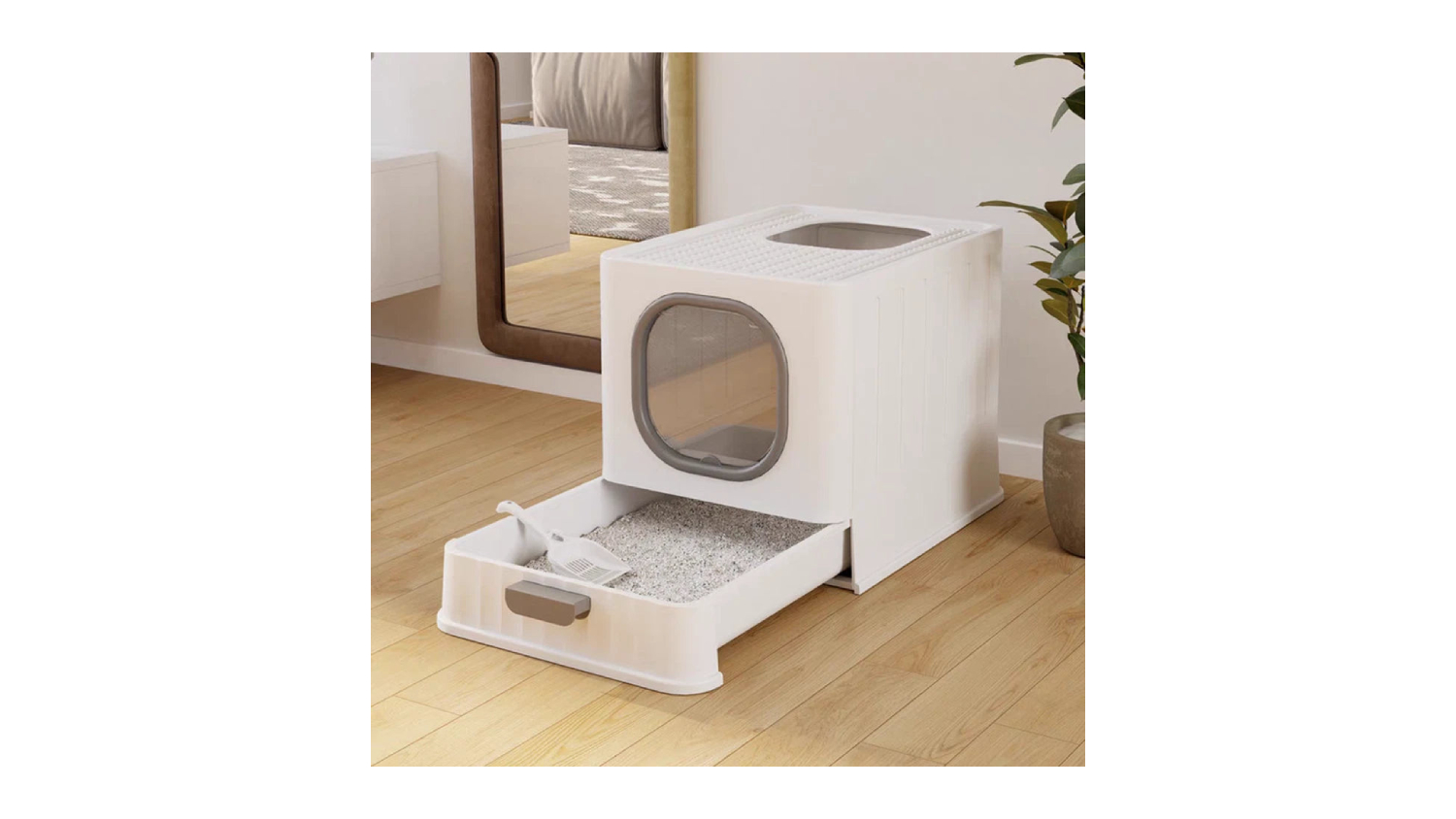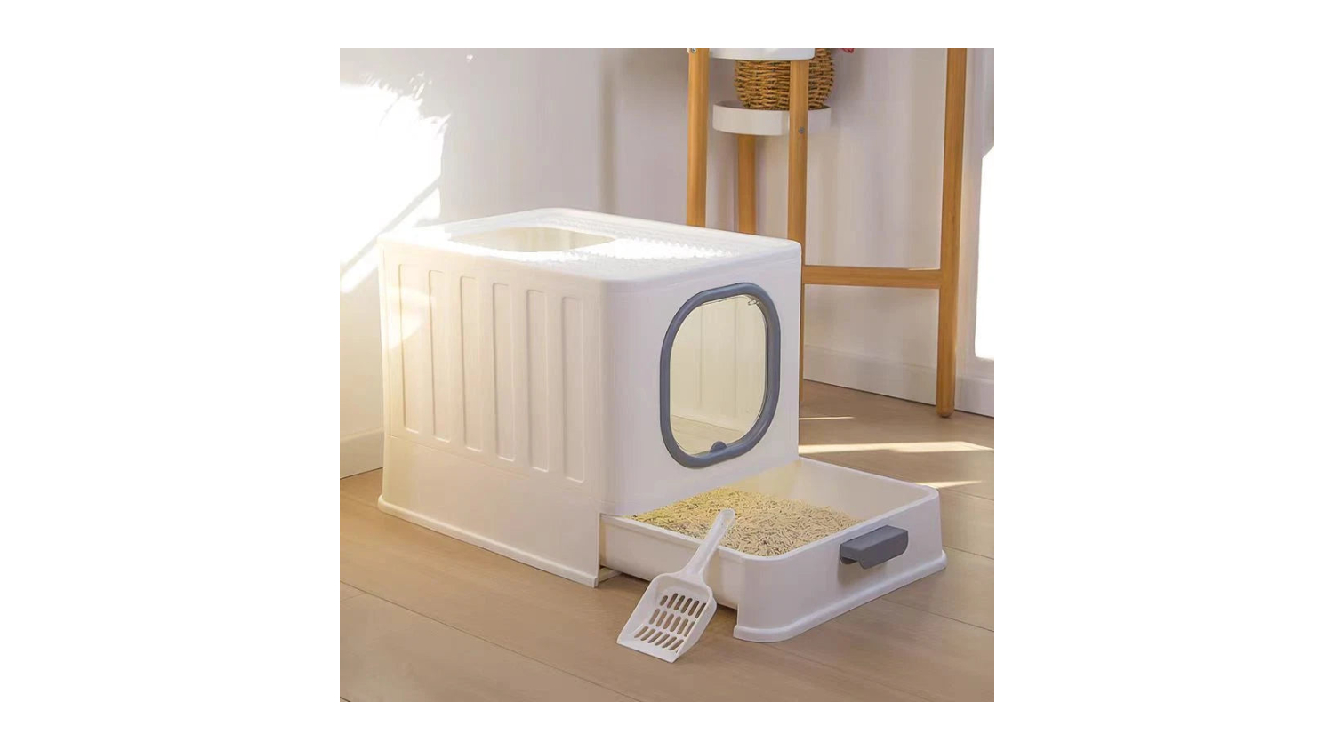 Elevate your cat's potty routine while keeping your floor pristine, thanks to the Pretty & Practical Multi-Entry Covered Cat Litter Box with Sliding Tray. This unit features a covered enclosure, multiple entries, and a quick-slide cleanup tray, providing maximum privacy for your furry friend and instant mess-free maintenance for you. It also highlights a low visual profile with a white finish to blend well with most homes.
