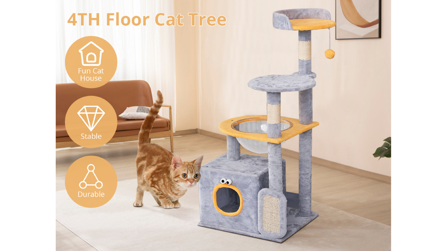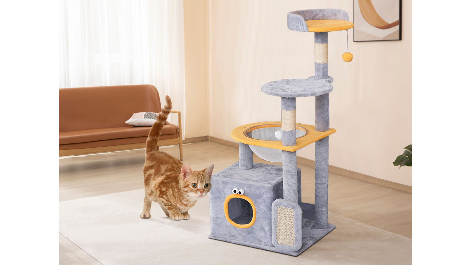 TSB Living Cat Tree with Hidey Hole, Pompoms, Panoramic Bowl 111cm - Grey/Orange