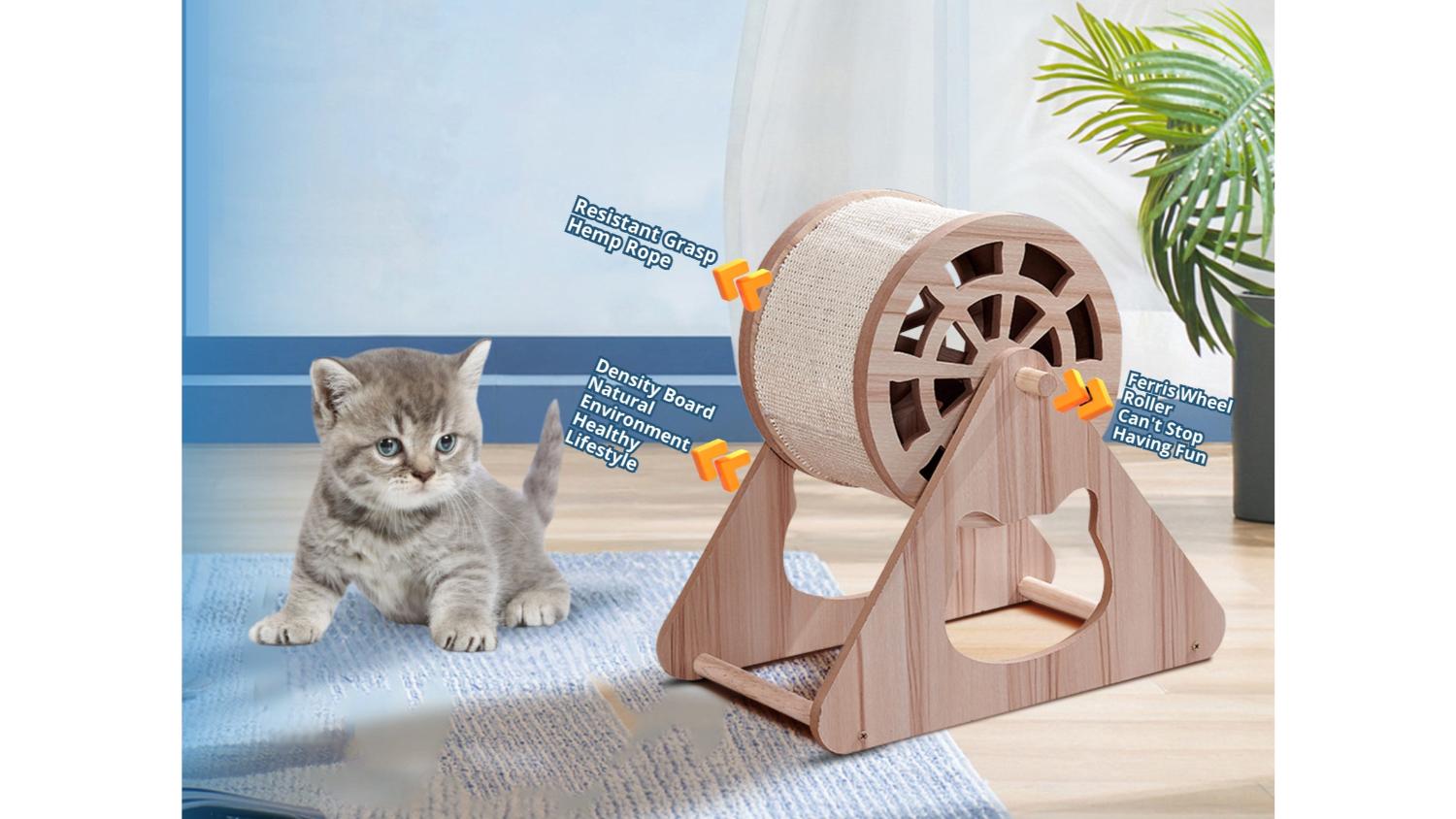 Keep your kitty entertained and your furniture scratch-free with the TSB Living Hemp Fabric Cat Scratching Wheel! This unit features a sturdy wooden base and an exciting Ferris wheel design, ensuring endless fun for your furry friend. Crafted with durable materials, including density board and resilient hemp rope, it protects your furniture while satisfying your cat’s need to scratch.