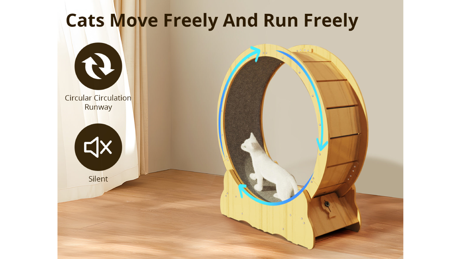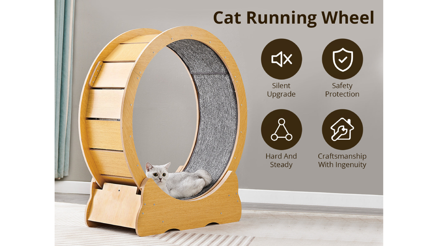 Keep your furry friend fit and happy with our TSB Living Running Wheel for Cats 93cm. This durable, wooden wheel features a large diameter for comfortable running, walking, and stretching. It's designed with safety in mind, featuring anti-pinch features and a secure lock. Plus, its quiet operation and removable carpet make it easy to clean and use.