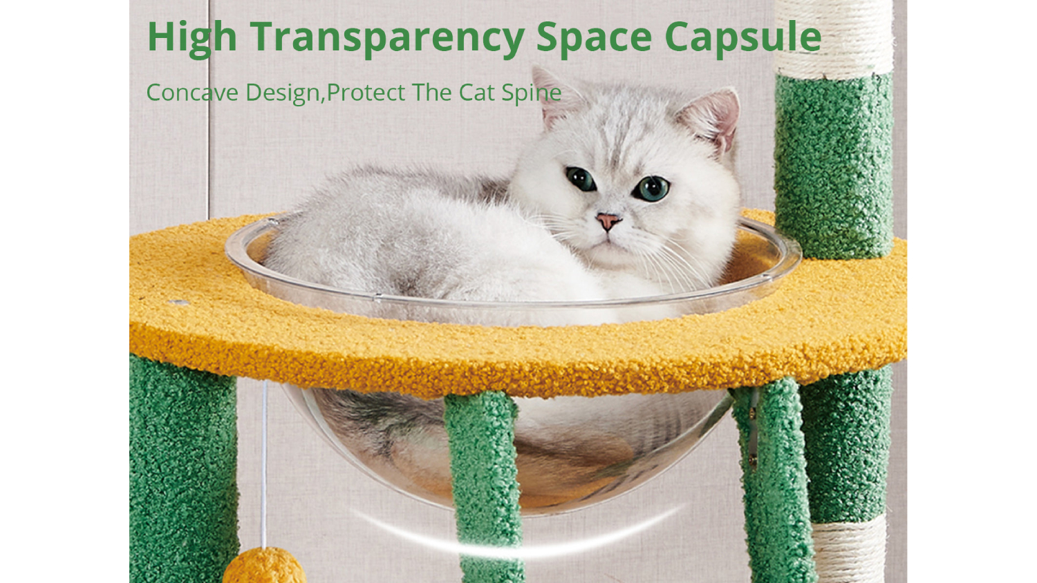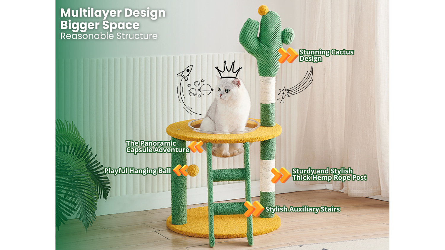 Spoil your feline friend with TSB Living Themed Cat Nap Tree with Panoramic Bowl, Pompom! This all-in-one haven features multiple platforms, a panoramic capsule, and a cosy cat house for your cat to explore. The durable wood construction and eco-friendly sisal scratching posts ensure long-lasting enjoyment and protection for your furniture.