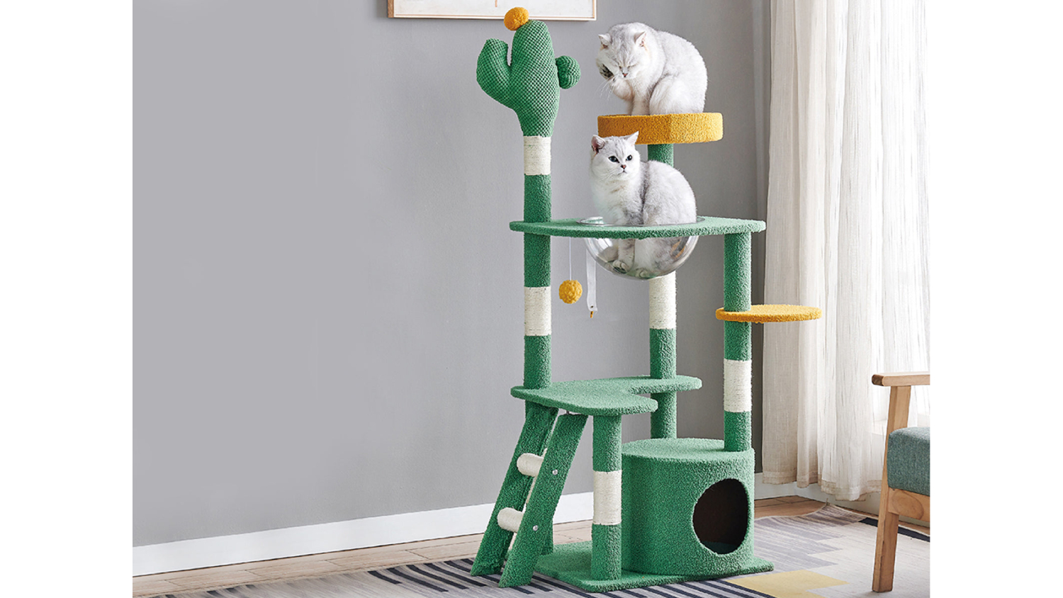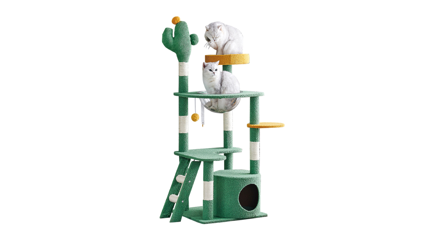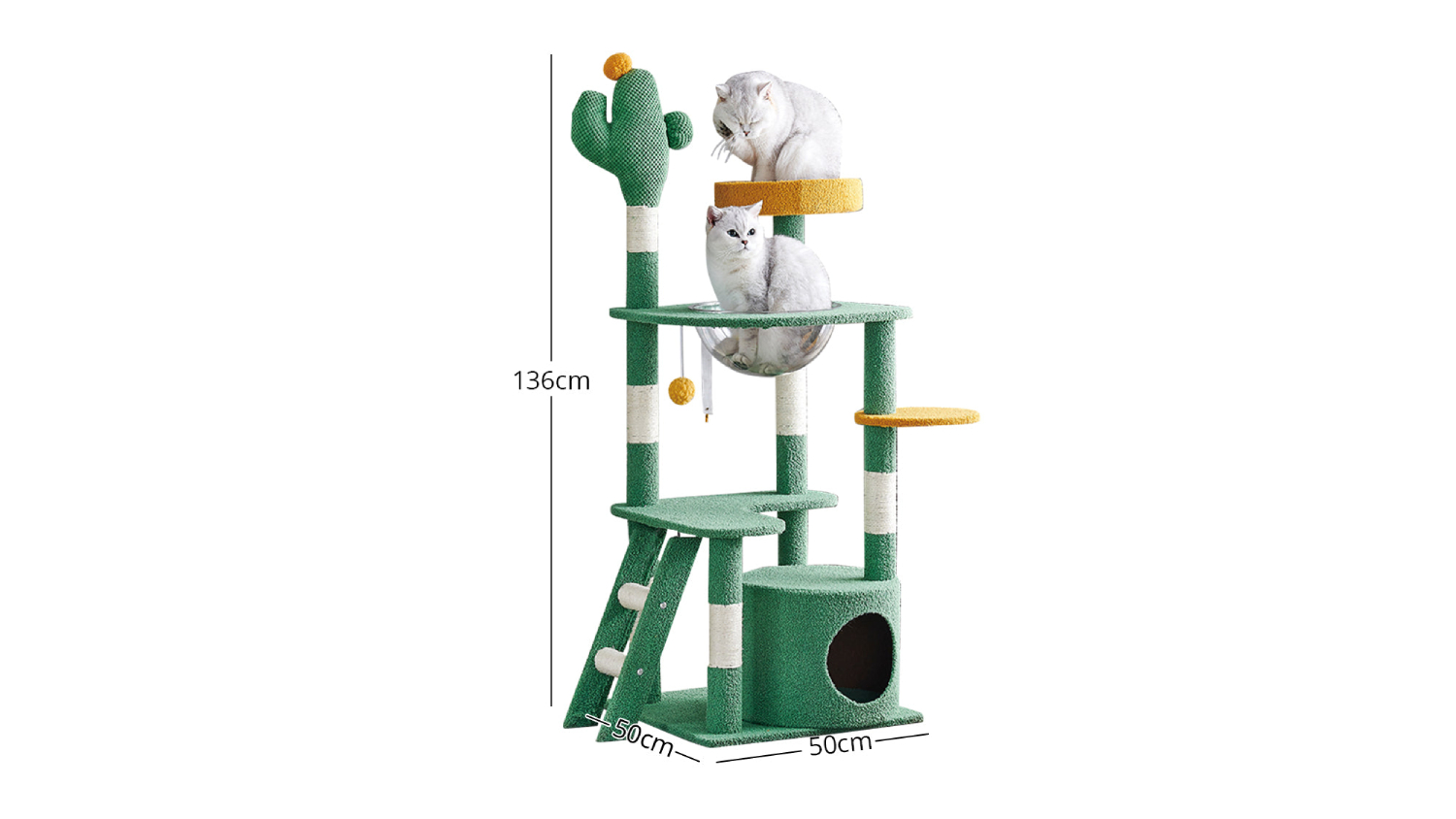 Spoil your feline friend with TSB Living Themed Cat Tree with Hidey Hole, Pompom, Panoramic Bowl 1.36m! This all-in-one haven features multiple platforms, a cosy hideout, and a panoramic capsule for your cat to explore. The eco-friendly sisal scratching posts ensure long-lasting enjoyment and protection for your furniture.
