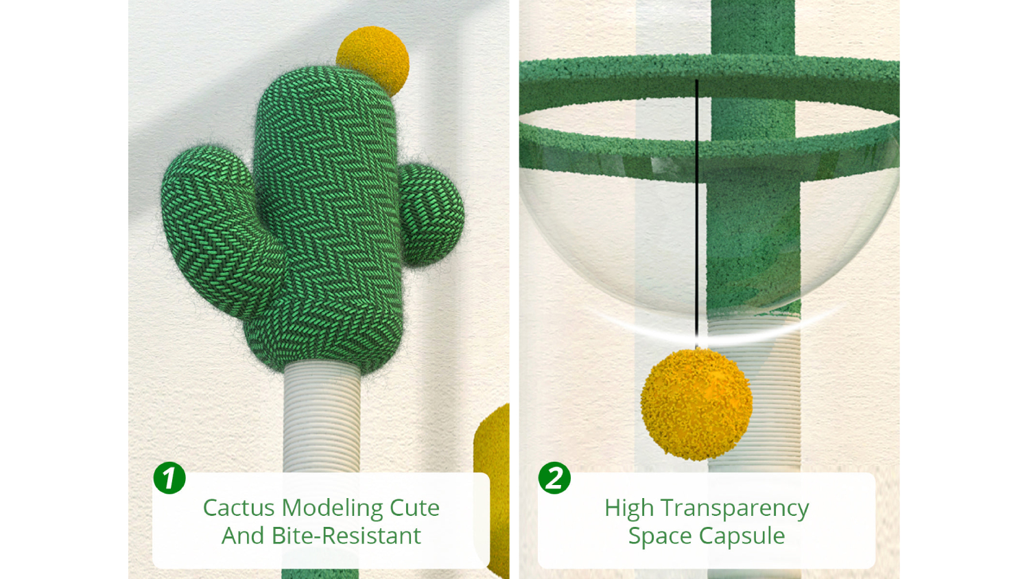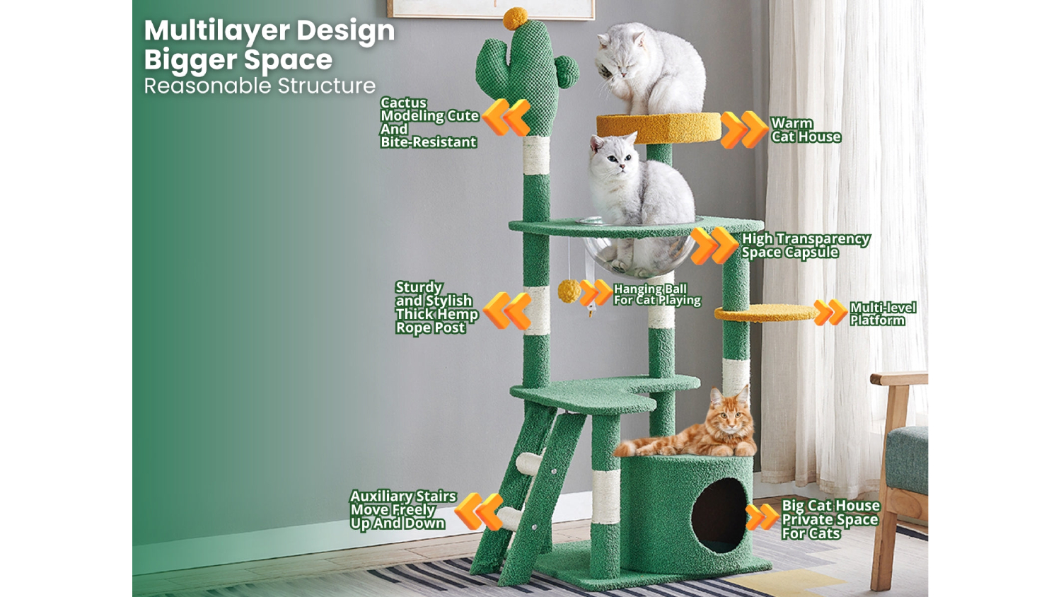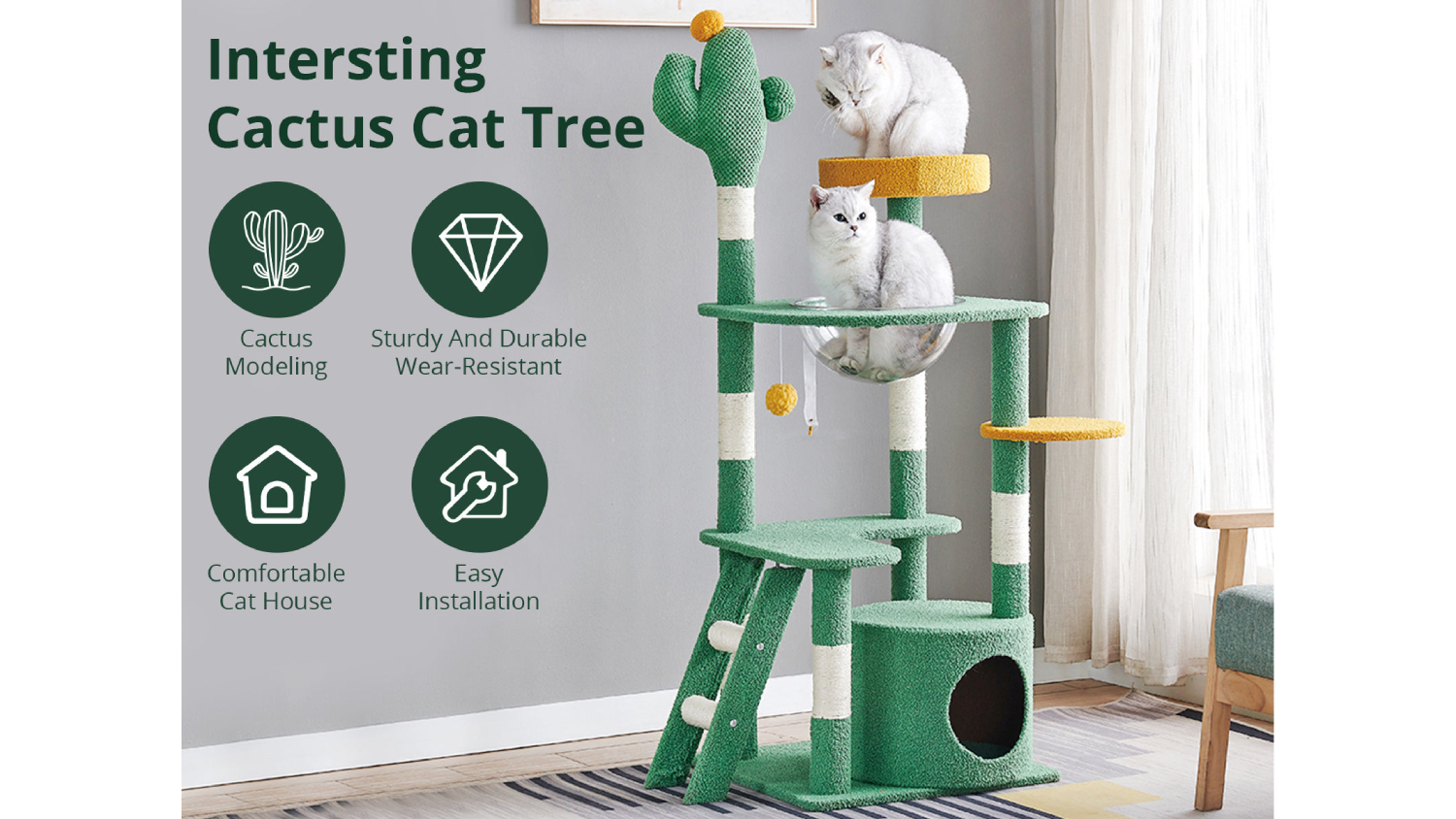Spoil your feline friend with TSB Living Themed Cat Tree with Hidey Hole, Pompom, Panoramic Bowl 1.36m! This all-in-one haven features multiple platforms, a cosy hideout, and a panoramic capsule for your cat to explore. The eco-friendly sisal scratching posts ensure long-lasting enjoyment and protection for your furniture.