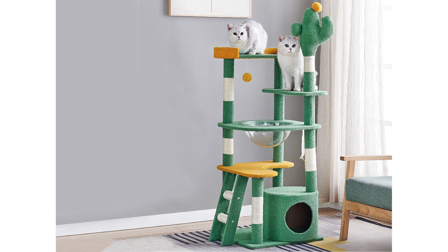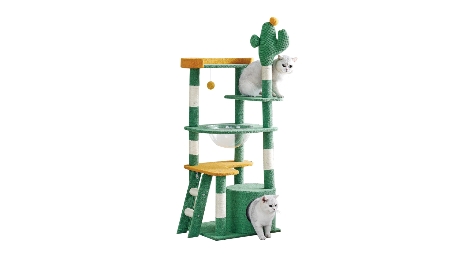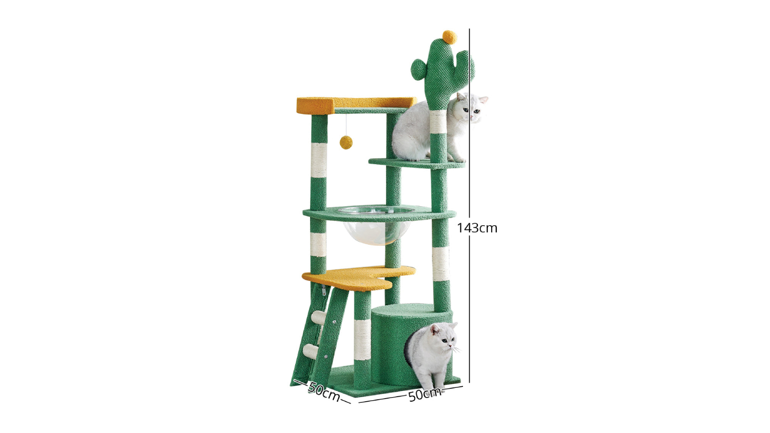 Spoil your feline friend with TSB Living Themed Cat Tree with Hidey Hole, Pompom, Panoramic Bowl 1.43m! This all-in-one haven features multiple platforms, a cosy hideout, and a panoramic capsule for your cat to explore. The eco-friendly sisal scratching posts ensure long-lasting enjoyment and protection for your furniture.
