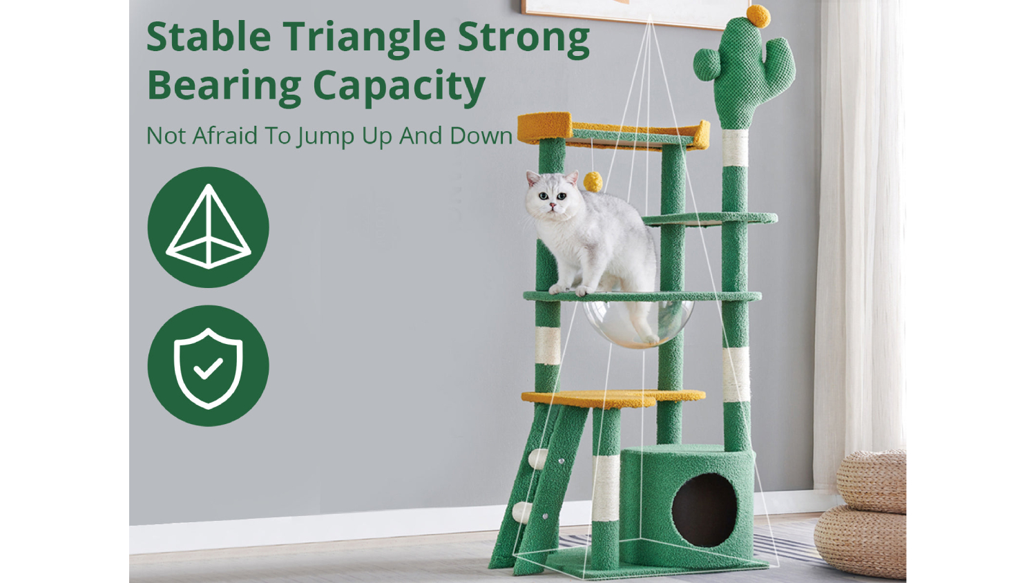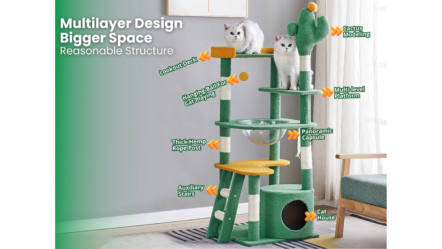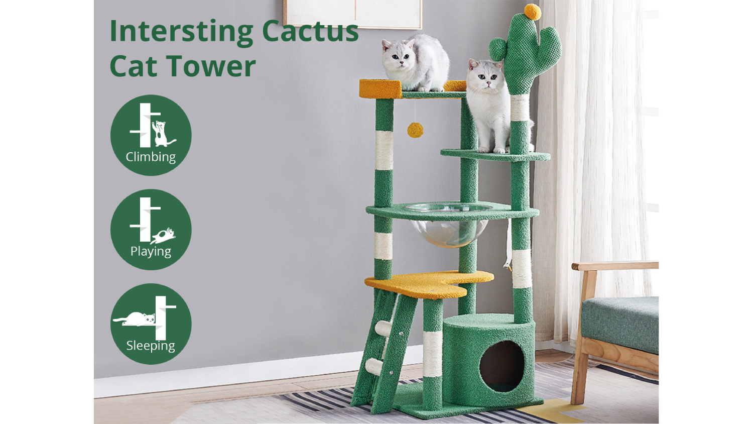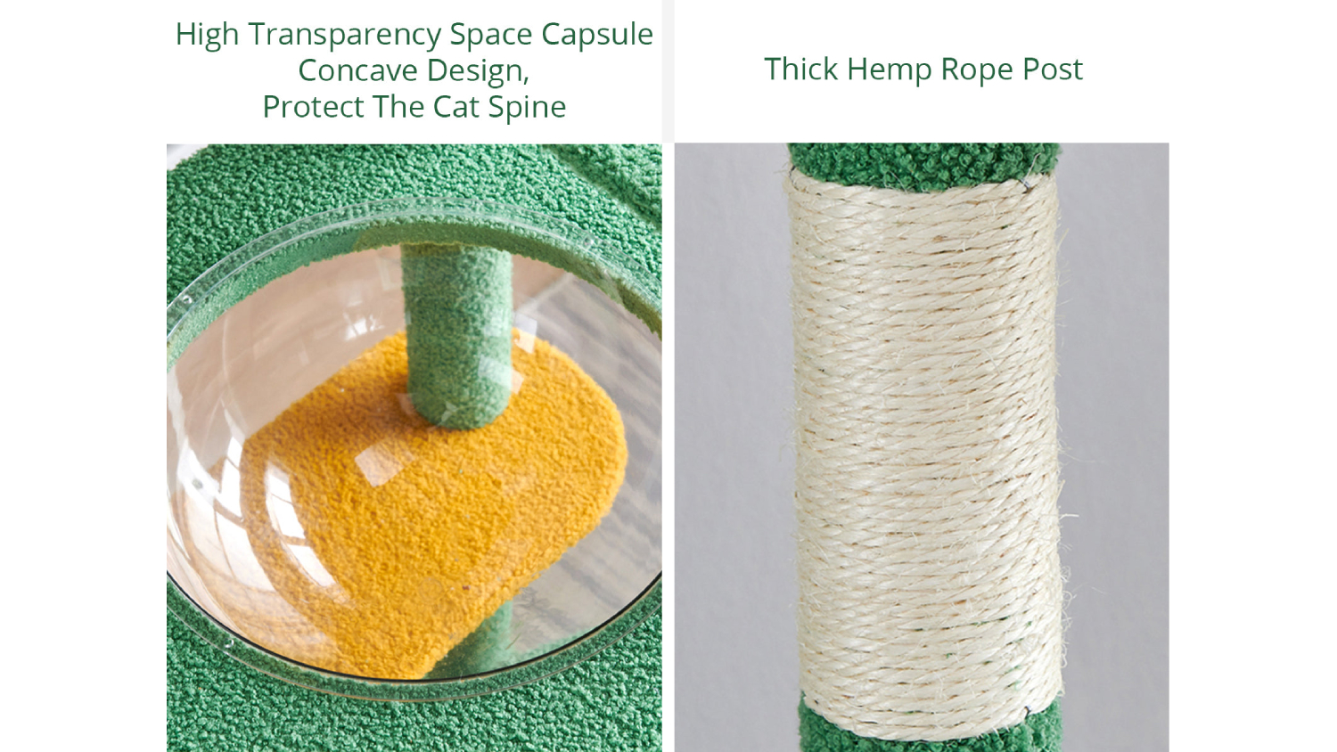 Spoil your feline friend with TSB Living Themed Cat Tree with Hidey Hole, Pompom, Panoramic Bowl 1.43m! This all-in-one haven features multiple platforms, a cosy hideout, and a panoramic capsule for your cat to explore. The eco-friendly sisal scratching posts ensure long-lasting enjoyment and protection for your furniture.