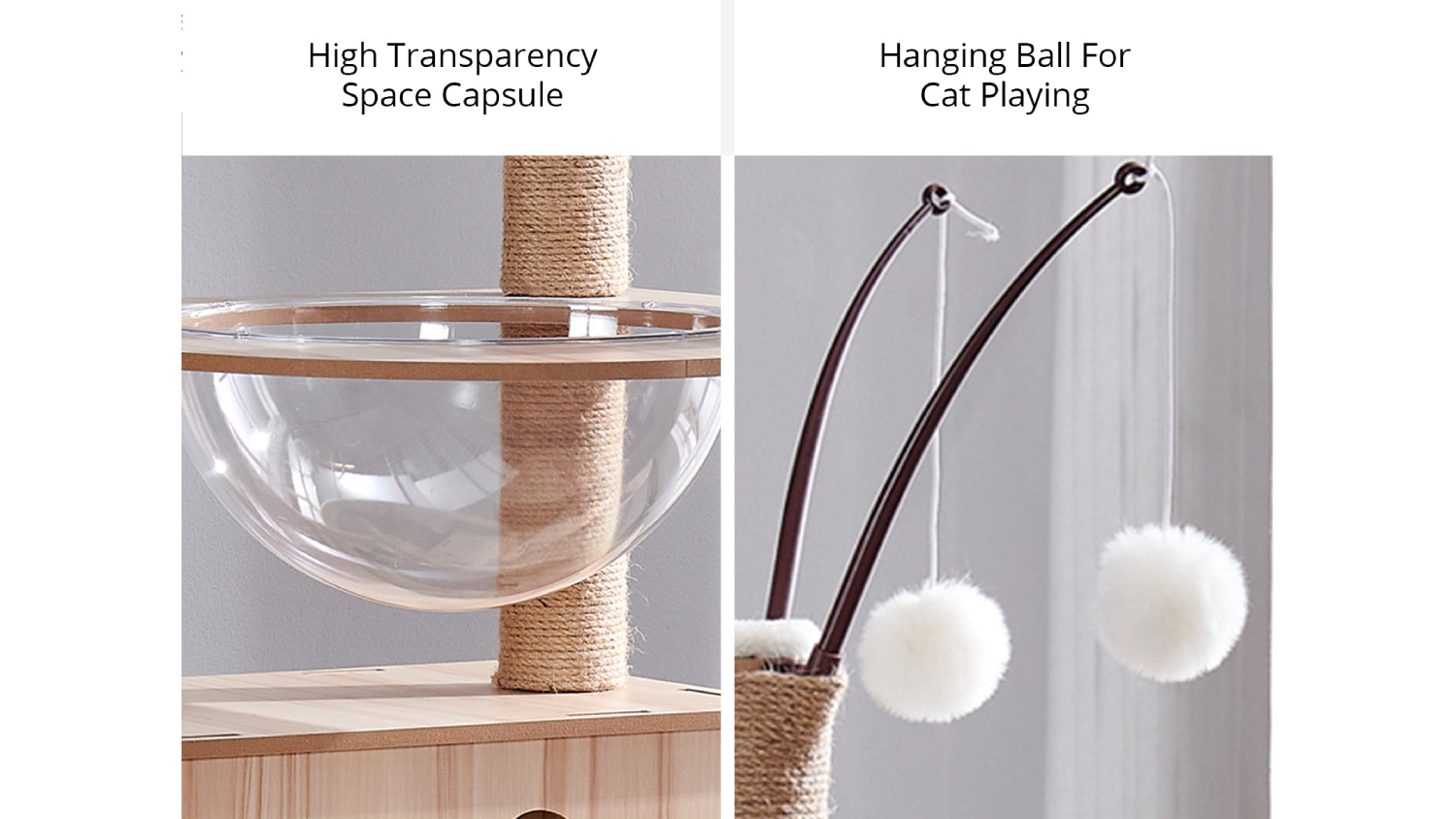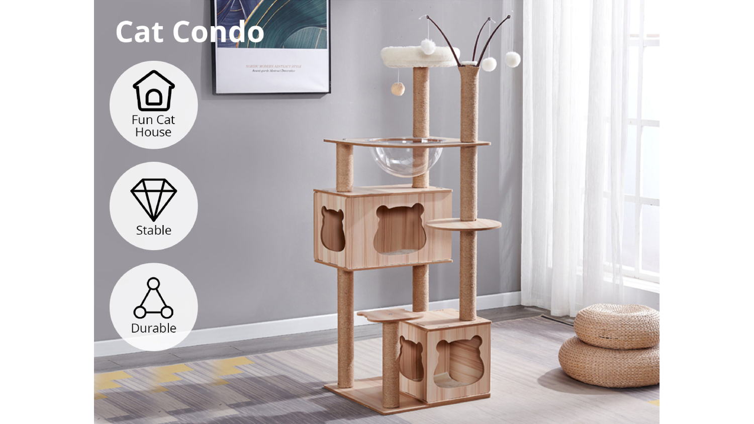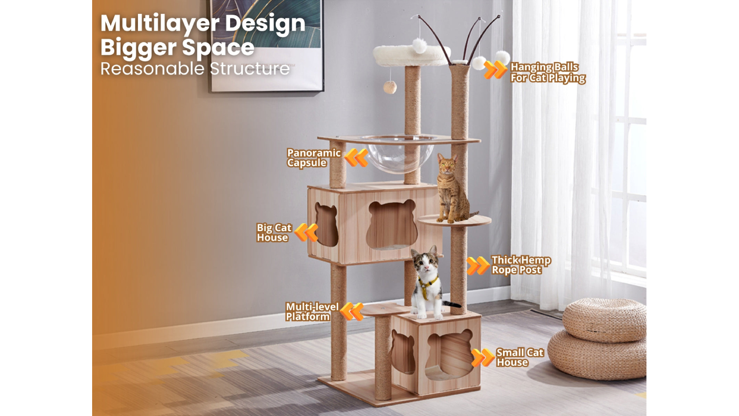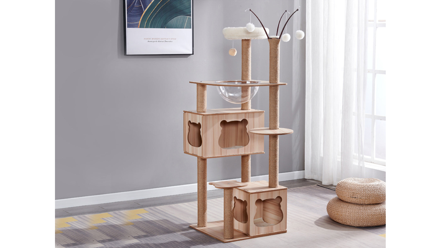 Spoil your feline friend with TSB Living Wooden Cat Tree with Scratching Posts, Panoramic Bowl, and Hidey Houses! This all-in-one haven features multiple platforms, a cosy hideout, and a panoramic capsule for your cat to explore. The durable wood construction and eco-friendly sisal scratching posts ensure long-lasting enjoyment and protection for your furniture.