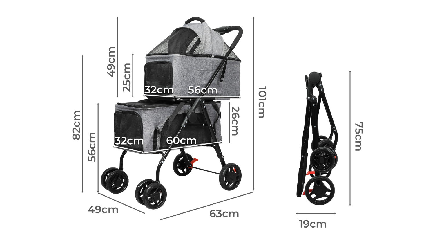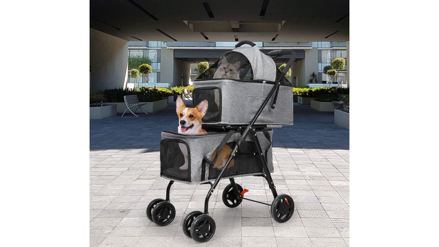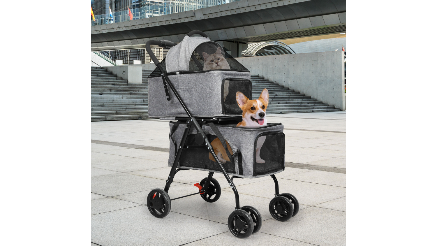 PaWz Foldable 2 Tier Pet Stroller with Domed Cover, Safety Harness - Grey
