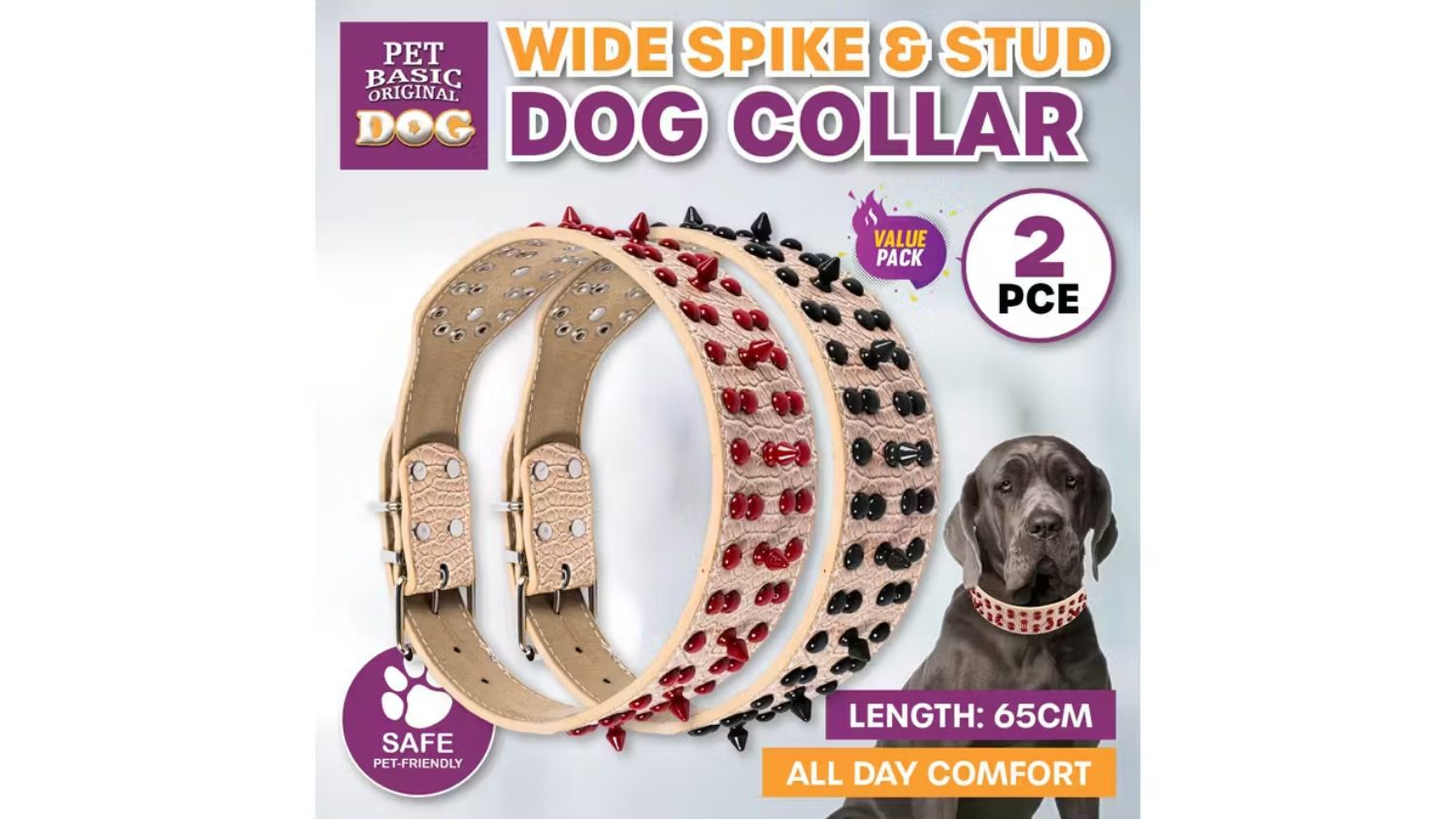 Give your furry pal a stylish upgrade with the Wide Spike & Stud Dog Collar. It's made of strong and flexible material, ensuring a comfortable fit for medium to large dogs. You can also easily attach a leash to this collar, thanks to its sturdy buckle and lead loop.