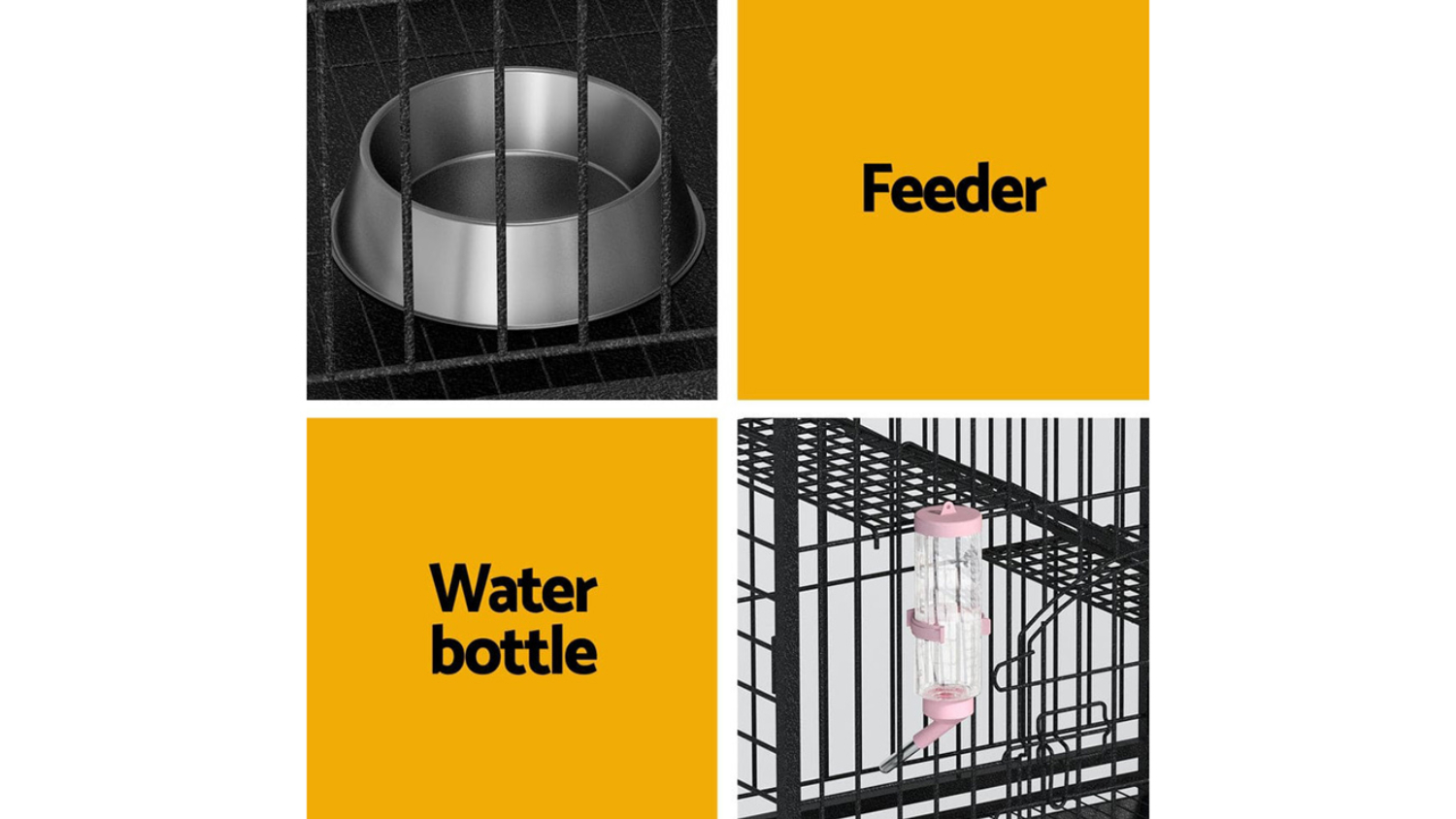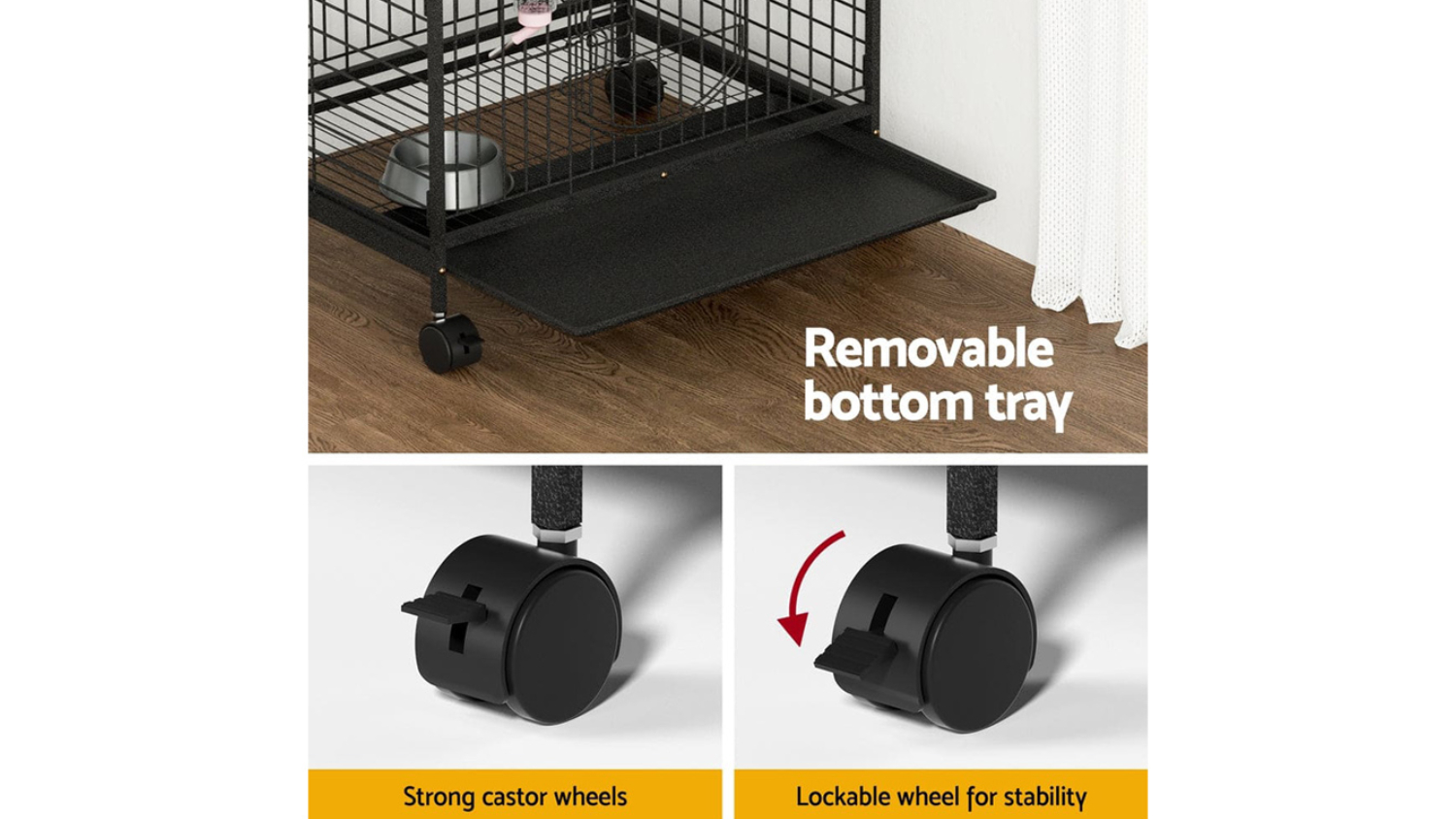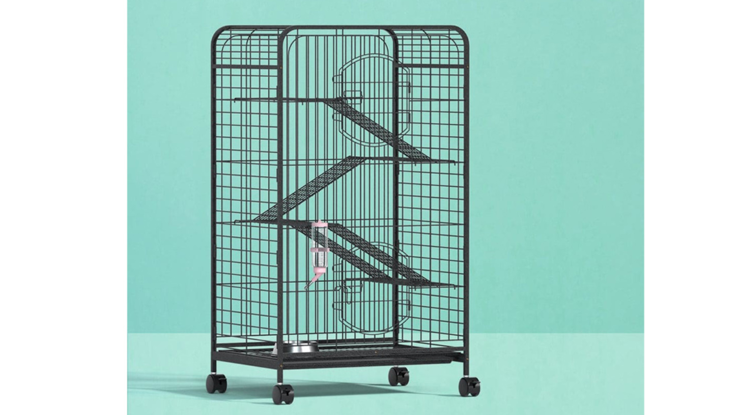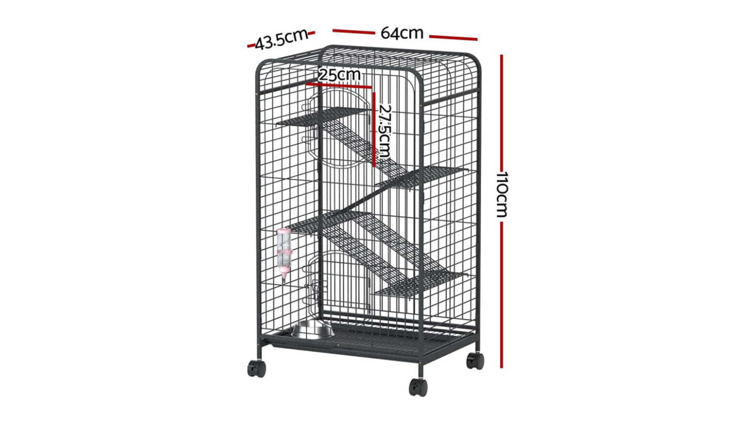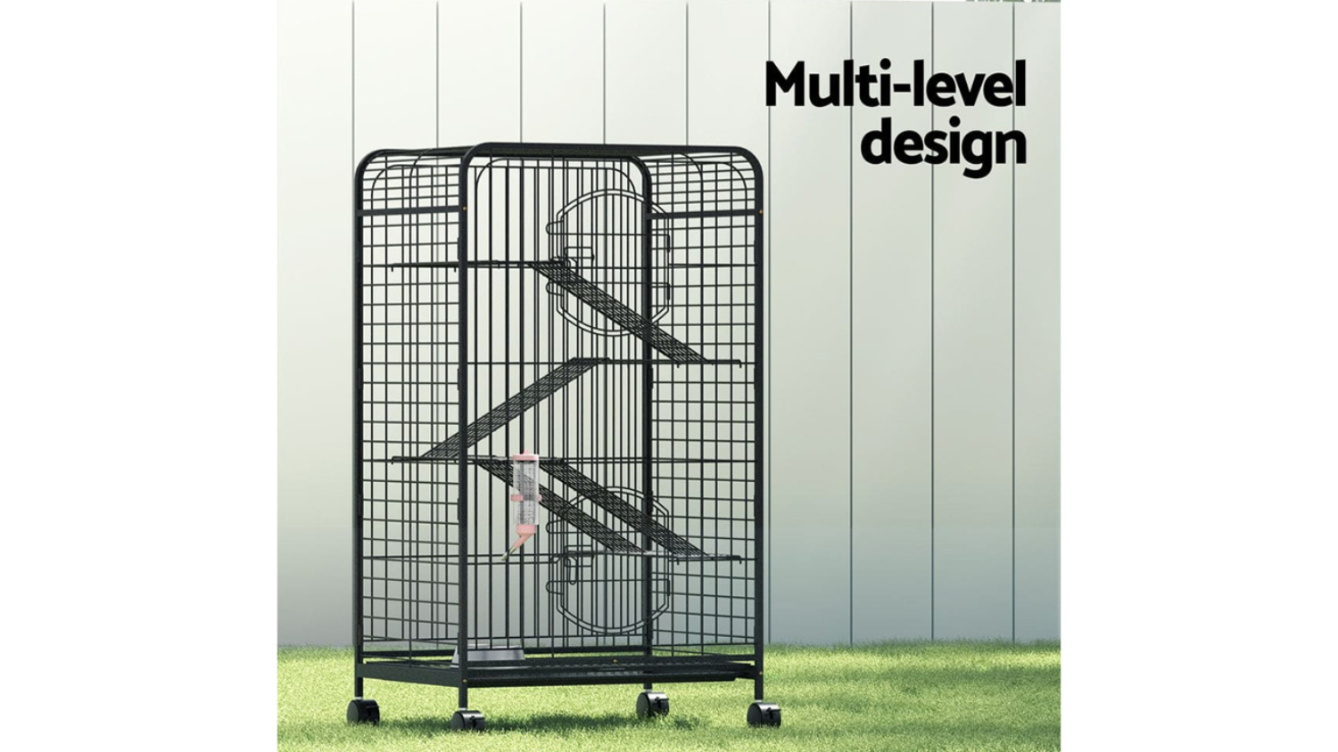 Give your fur baby a spacious home with the I.Pet Anti-Rust Indoor Small Animal Habitat. This four-level shelter is built with a durable, anti-rust, black powder-coated metal frame. It provides easy access via two doors and connects levels with ladders and ramps. For ultimate convenience, it also includes a removable tray, castor wheels, a water bottle, and a feeder.