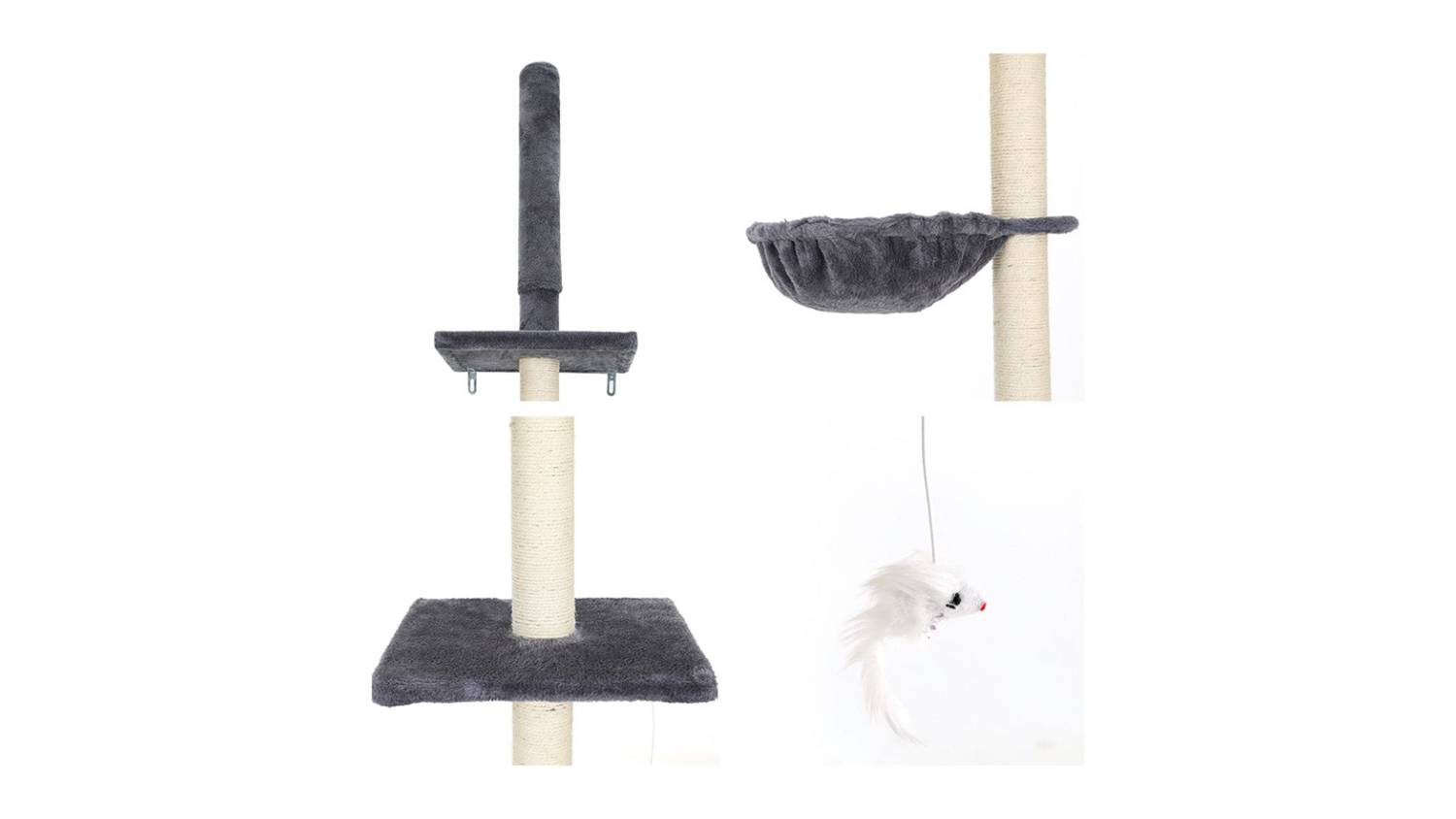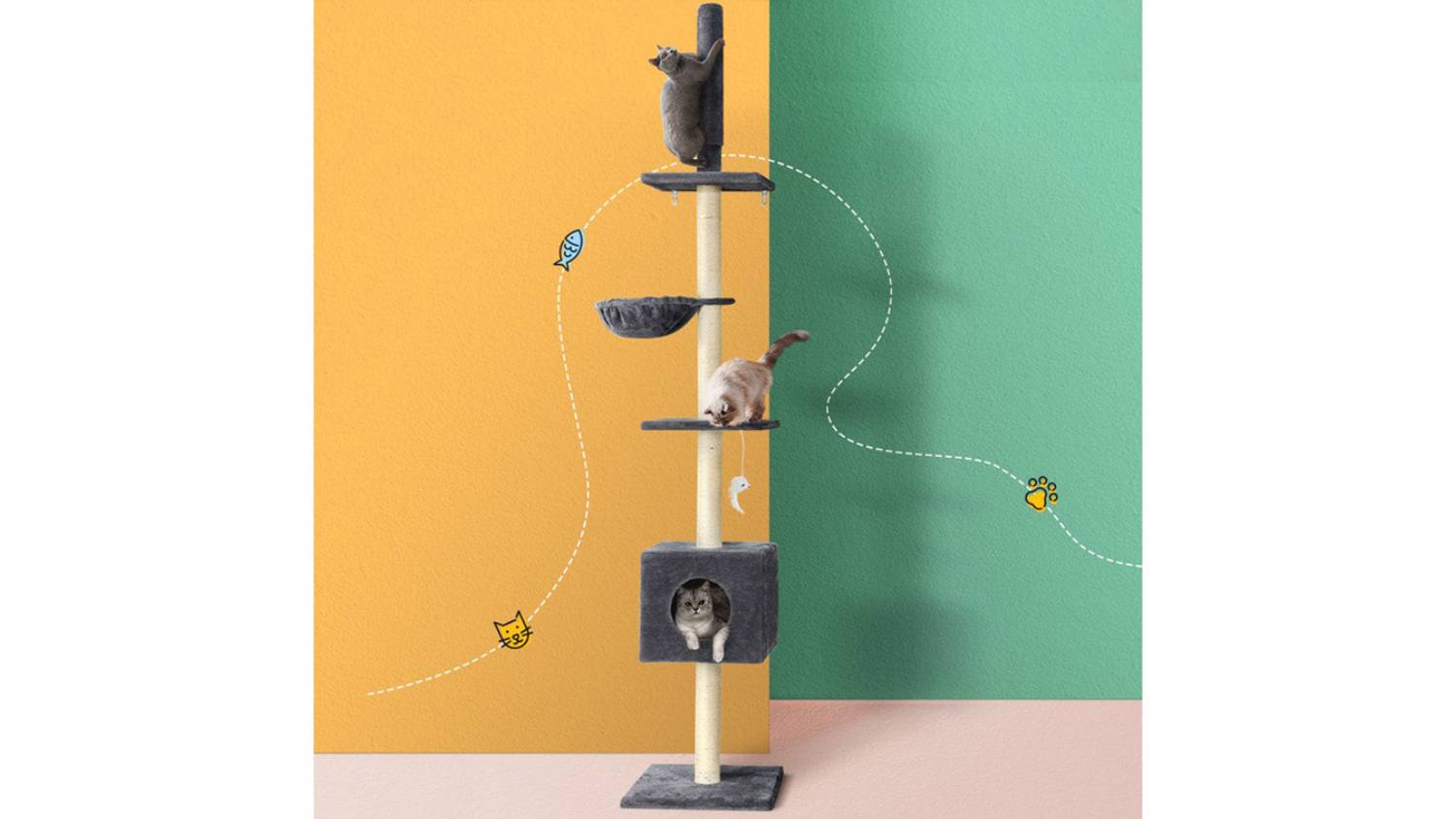 Maximise your cat's fun with the I.Pet Floor to Ceiling Scratching Tower. This impressive cat tree gives your feline friend the high ground they crave, all built on a sturdy wooden frame and stable base. Featuring four plush-covered platforms, durable natural sisal scratching posts, and a cosy sleeping cubicle, it's the ultimate space-saver. This multi-level cat climber is the perfect way to satisfy their scratching, perching, and napping needs.