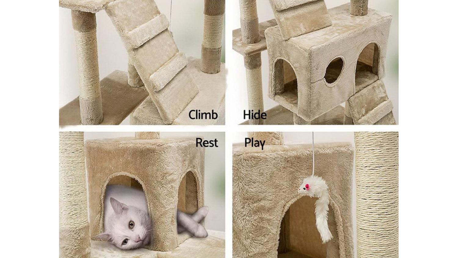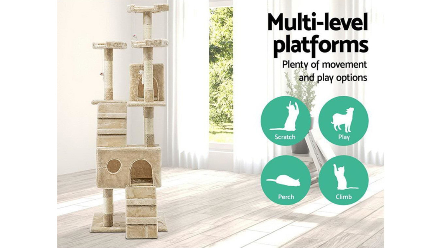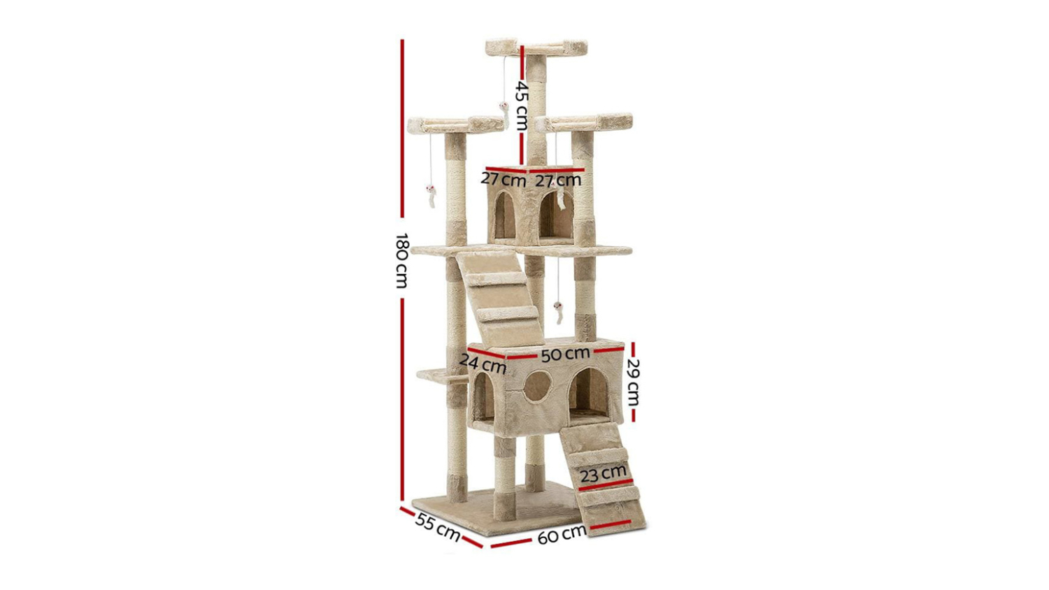 Give your feline friend the ultimate adventure centre with the I.Pet Giant 180cm Scratching Tower. This multi-level cat tree is built with stable wooden construction and covered in soft plush, offering ample space for activity. It features natural sisal posts, cosy bed cubes, cradles, and a ladder for climbing, plus fun hanging toys, making it the perfect all-in-one piece for scratching, perching, and sleeping.