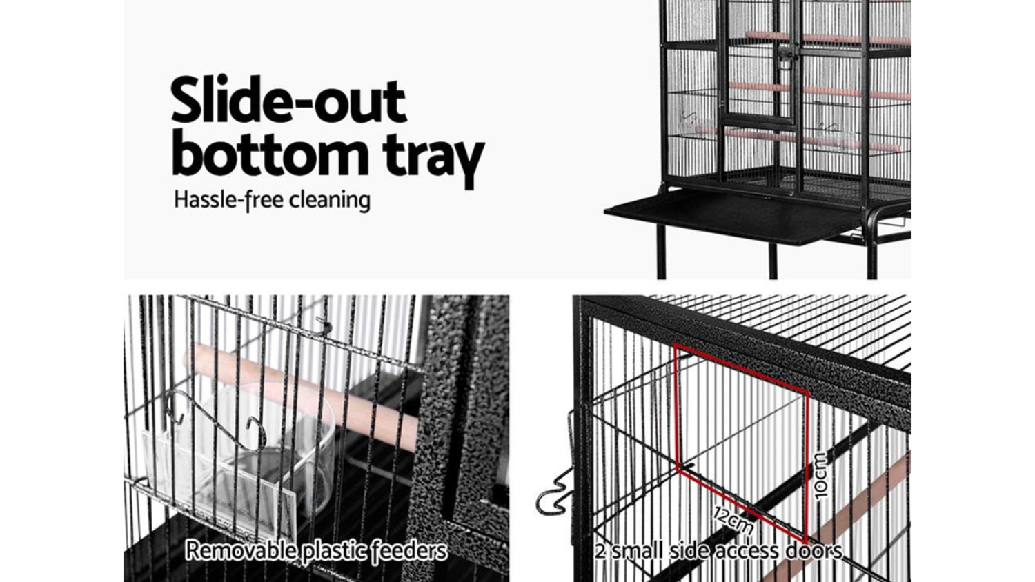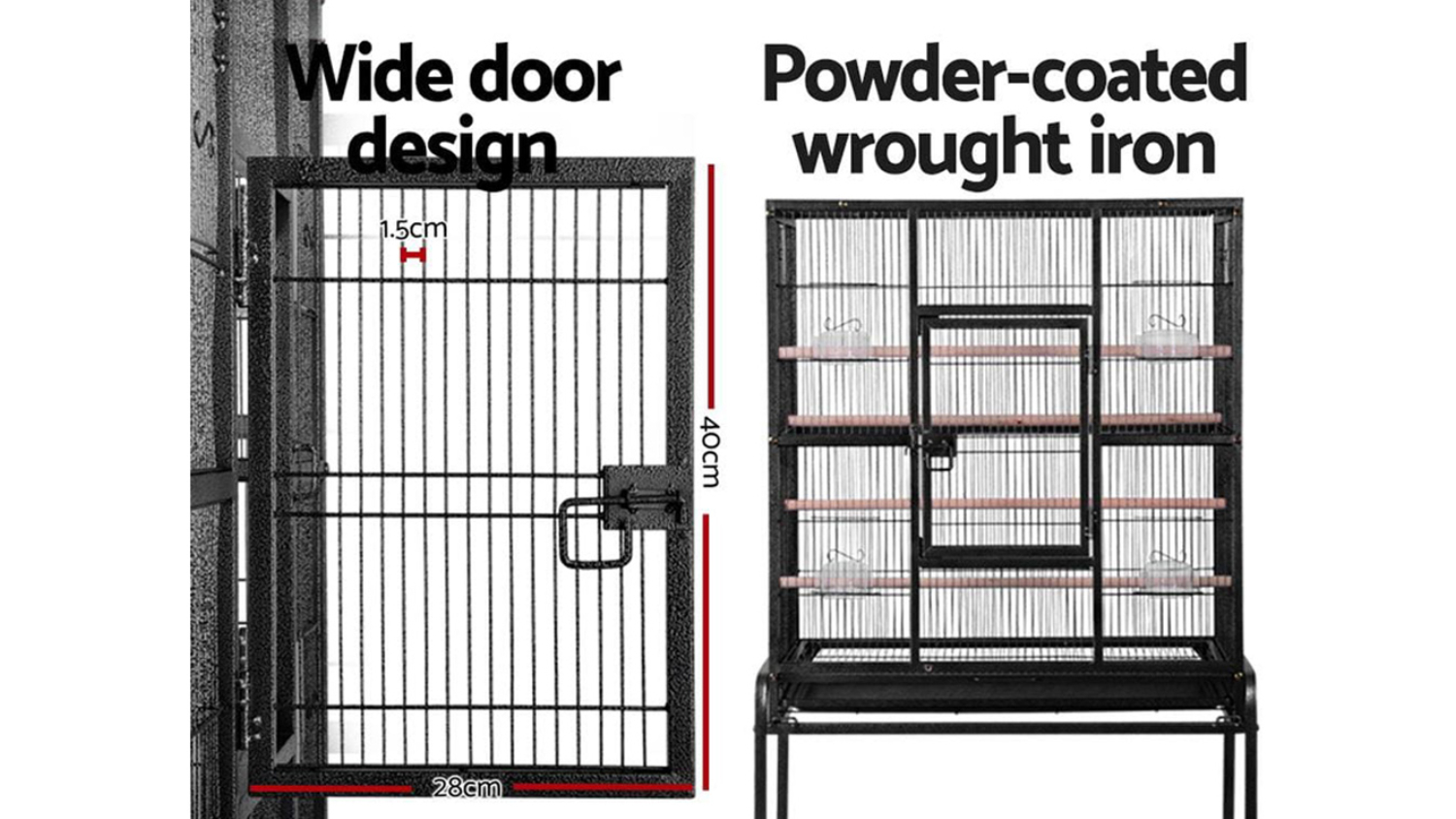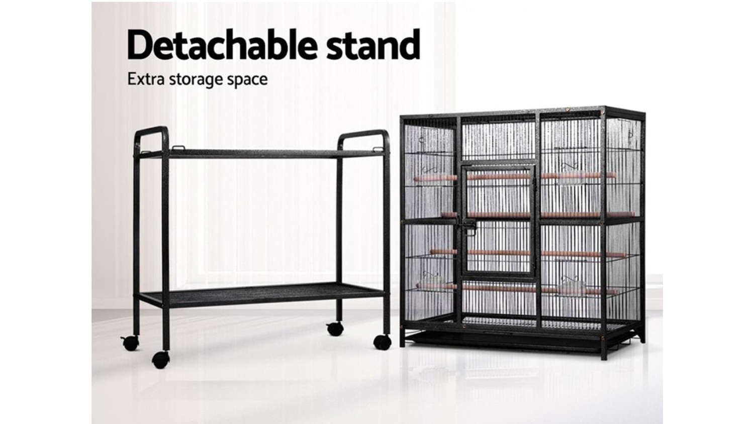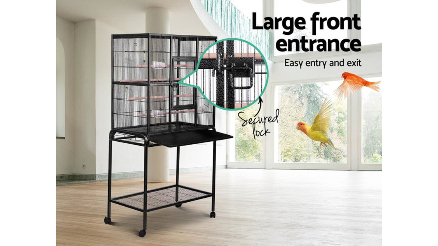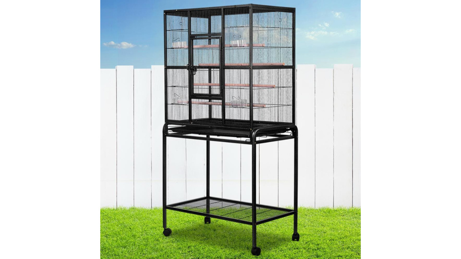 Mobility meets robustness with the I.Pet Large Travel Bird Cage Stand with Doors. Made from strong, non-toxic, powder-coated wrought iron, this cage includes two wooden perches, large lockable doors, a slide-out tray for easy cleaning, and castor wheels for smooth mobility. Plus, it’s a breeze to assemble and comes with a bottom shelf for extra storage.