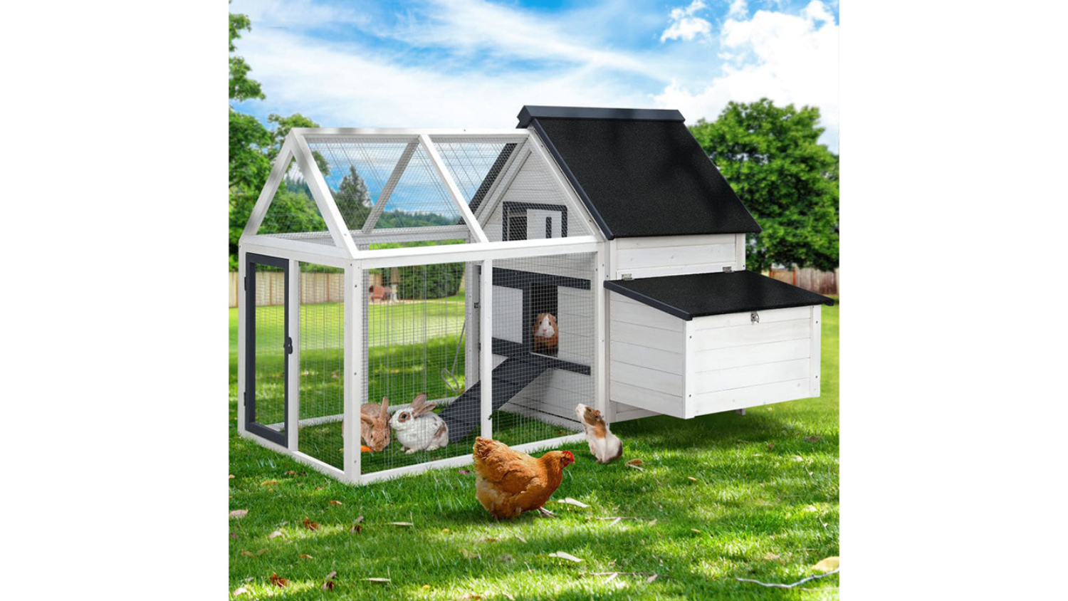 Create a comfy outdoor haven for your flock, rabbits, guinea pigs, chinchillas, or ferrets with the I.Pet Large Wooden Pet Coop/Hutch. This reliable shelter provides both an enclosed sleeping area and a secure space for your small pets. It’s built with water-resistant fir wood featuring a secure lock, egg hatching box, and a fantastic slide-out tray base for hassle-free cleaning.