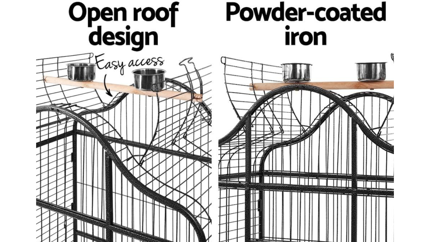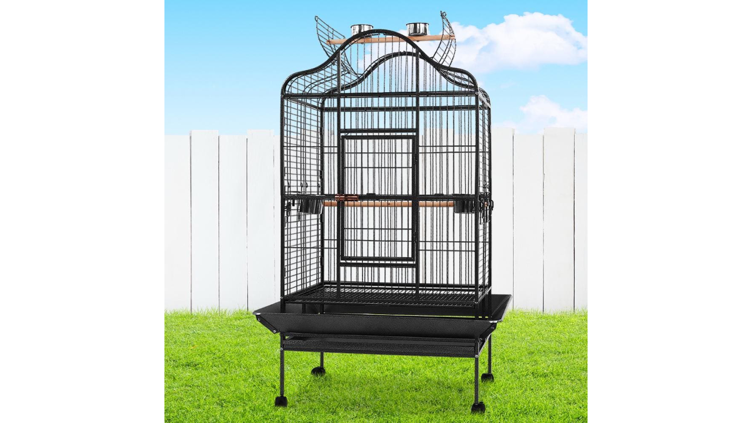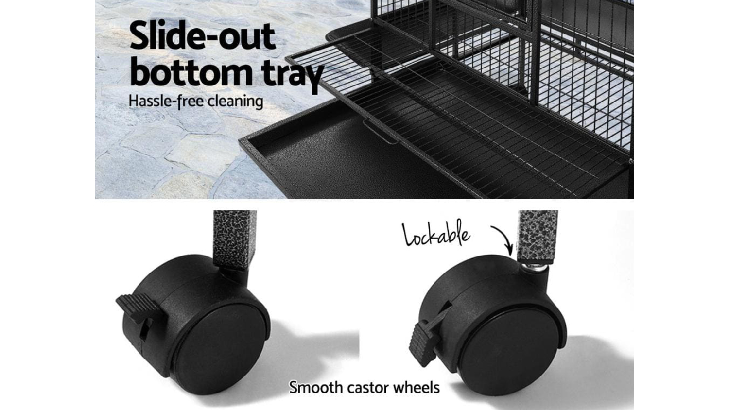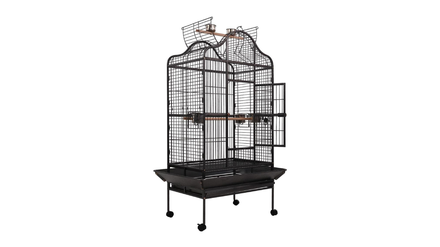 Shelter your feathered friend with the I.Pet Stainless Steel Large Travel Bird Cage. Made from heavy-duty wrought iron with a rust-resistant vein powder-coated finish, this cage features an open-roof design, two wooden perches, stainless steel feeders, and a large door for easy entry. It also offers smooth-rolling wheels, and a slide-out tray for quick clean-ups. Plus, it's a breeze to use and easy to assemble!