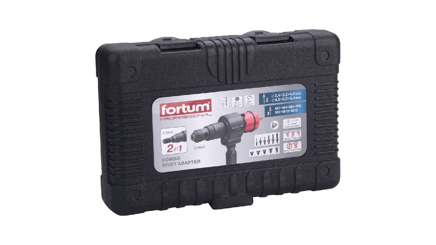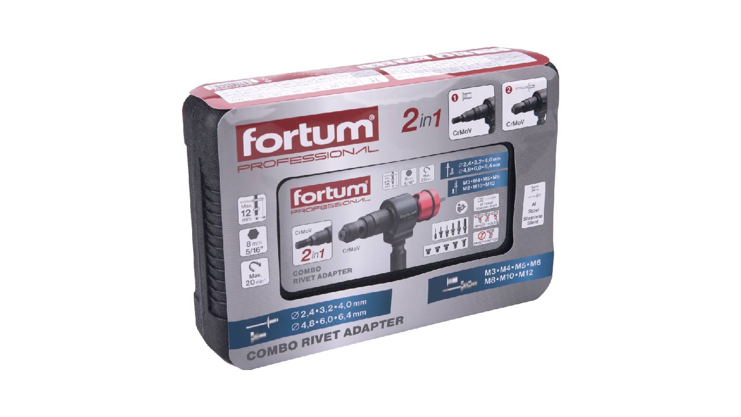 This game-changing Fortum Combination Rivet Drill Attachment empowers you to achieve professional results with ease. This tool combines two functionalities in one compact frame. It applies both nut and blind rivets, perfect to use with electric or battery-powered tools.