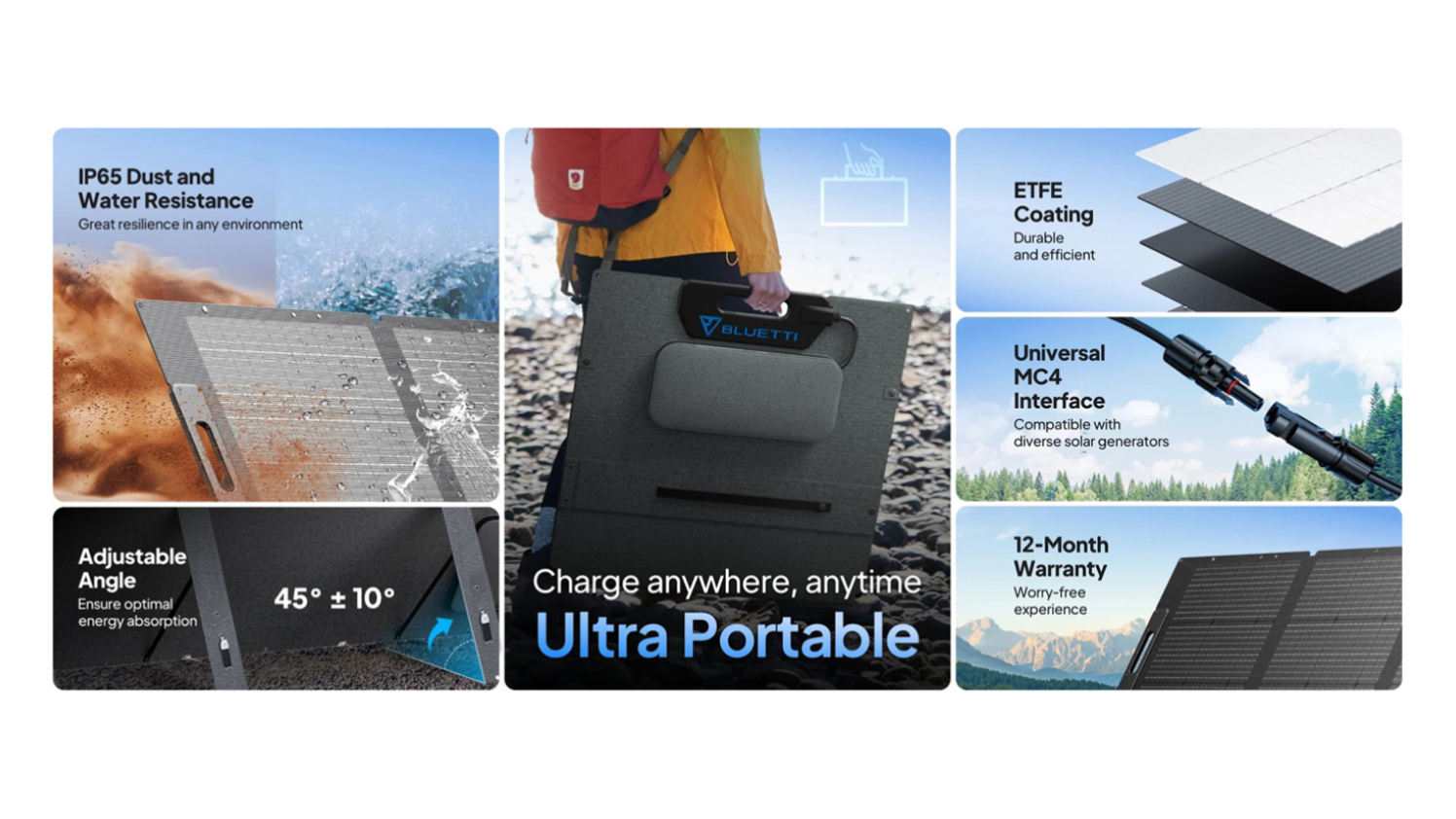 Take control of your energy needs with the BLUETTI SP200L Solar Panels 200W. This foldable solar power kit features a 23.4% conversion rate, letting you charge your solar generators quickly and sustainably. Built tough with IP67 weather resistance, this panel is ideal for camping in the wilderness and an ultimate companion for off-grid adventures.