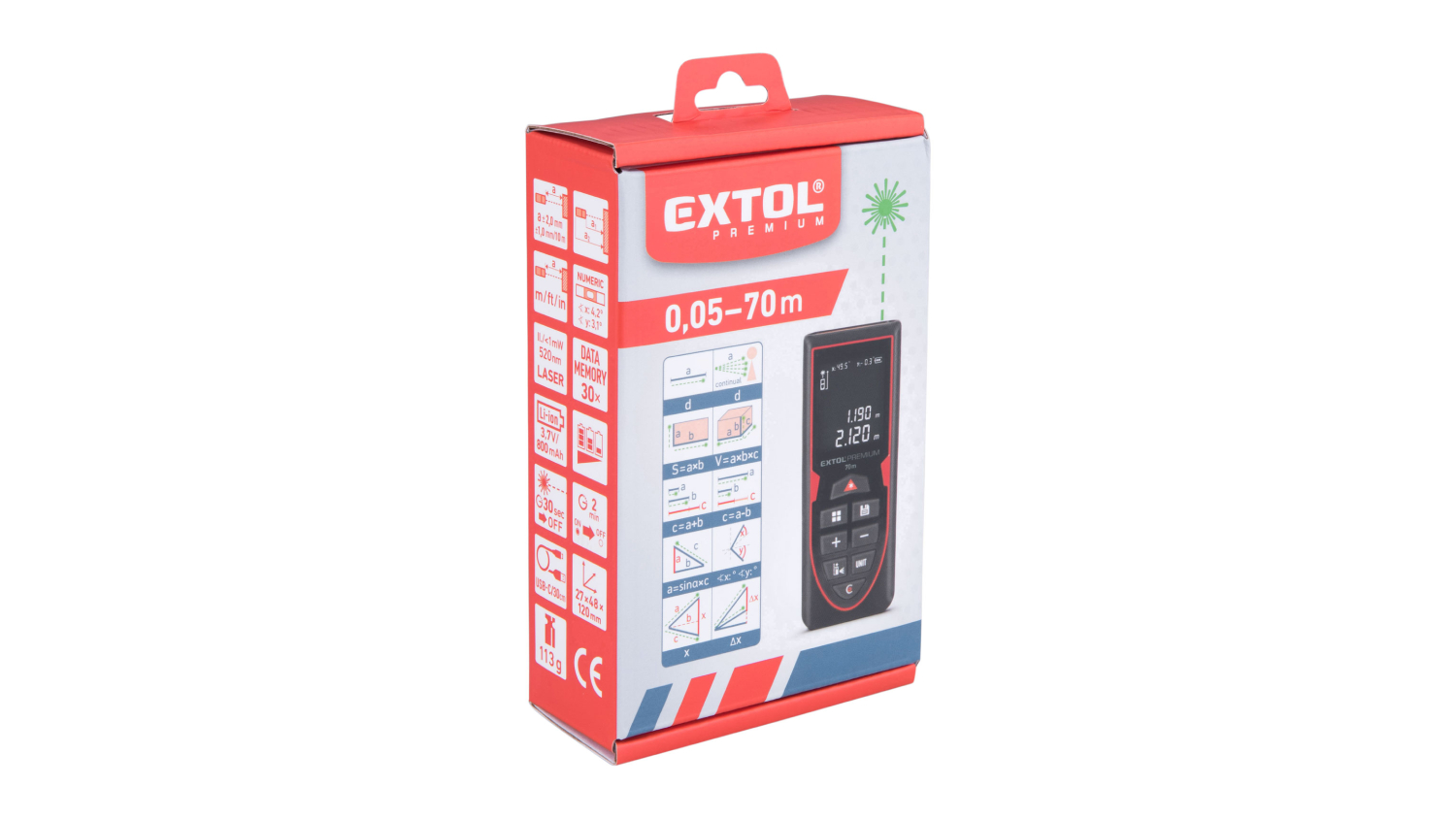 The Extol Rechargeable Laser Distance Measurer 70m makes measuring fast, accurate, and effortless. Powered by a USB‑C rechargeable Li‑ion battery, it measures distance, area, volume, and more. It’s perfect for professionals who want speed, precision, and portability.