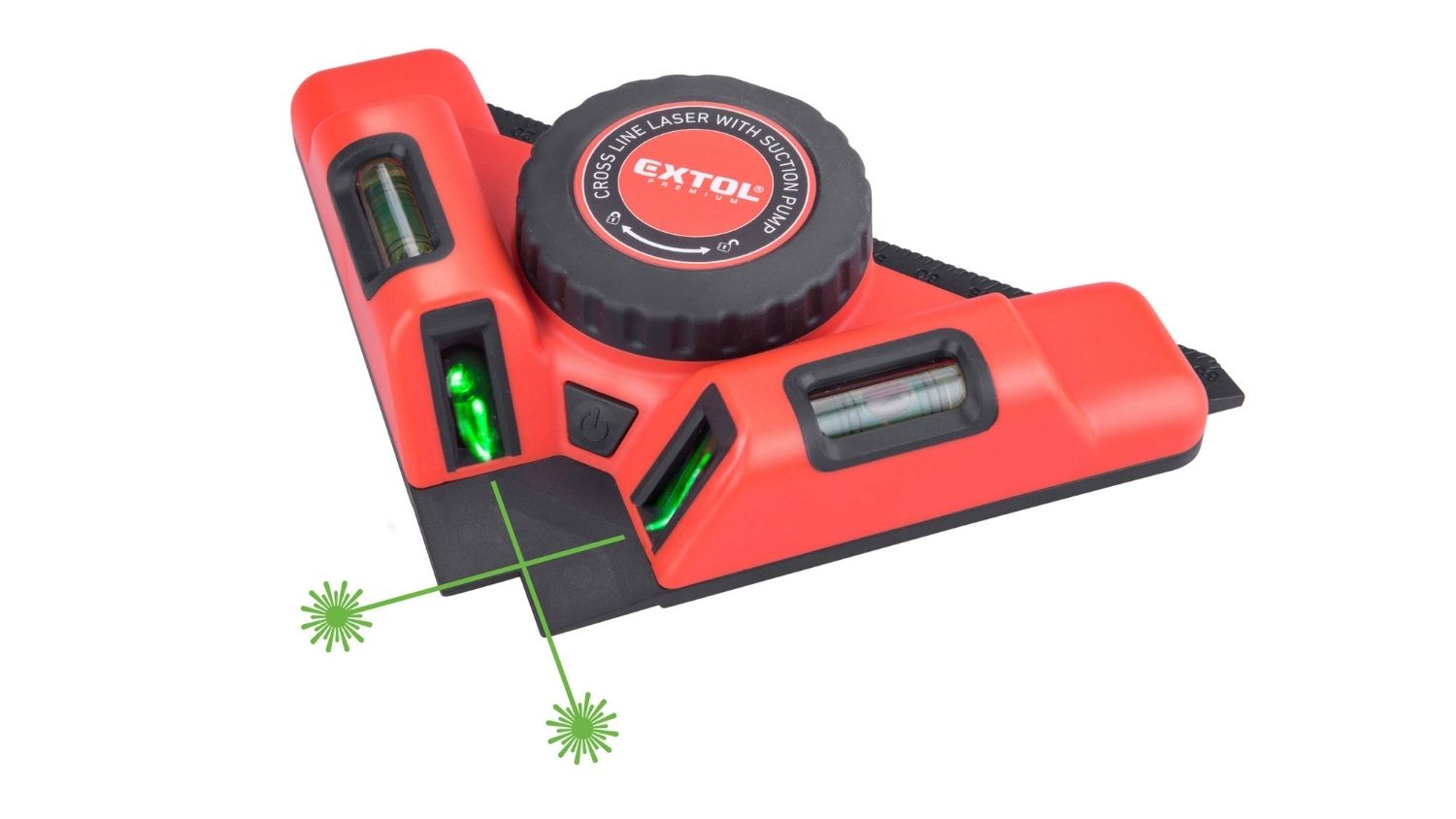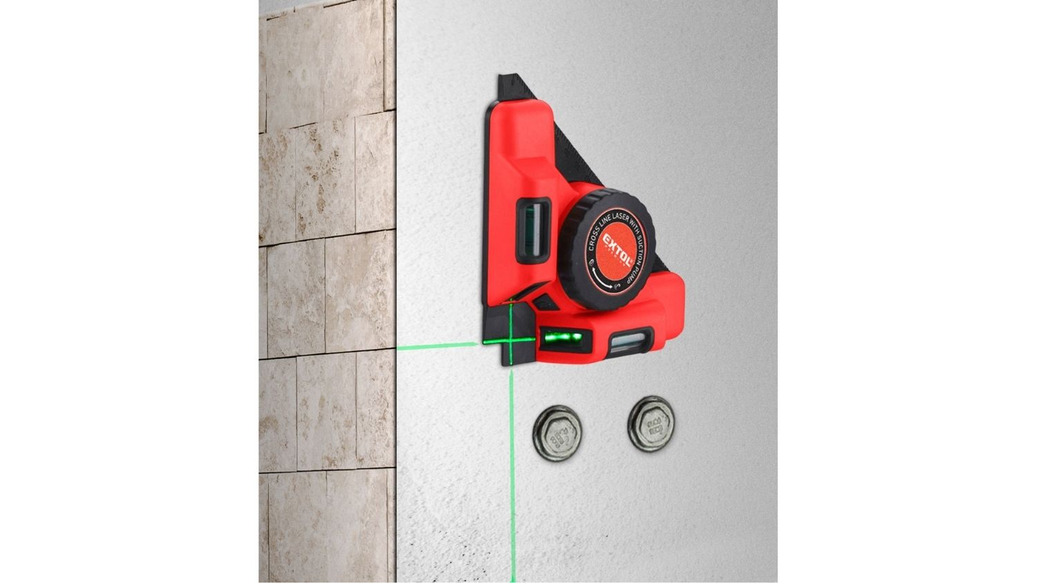 Perfect for both DIY and professional tasks, the Extol Right Angle Laser Level combines precision green laser lines with a built‑in vacuum pump for hands‑free operation. It securely mounts to non‑porous walls, making it ideal for tiling, decor alignment, and electrical fitting layouts. The intuitive control system uses a single button for laser and suction activation, with a separate switch for quick vacuum release. Plus, USB charging keeps it convenient, with up to 7 hours of working time on a full charge.