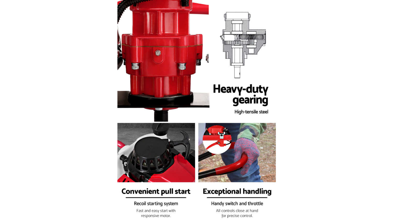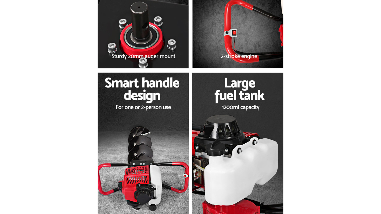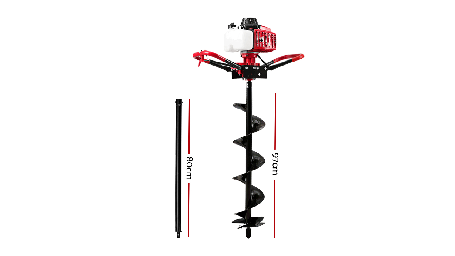 Revolutionise your outdoor projects with the Giantz Post Hole Auger 80cc Red/Black. This mighty tool is a game-changer for anyone involved in construction, landscaping, or farming. Powered by a high-performance 80cc engine, it lets you say goodbye to backbreaking manual post boring and digging. So whether you're digging holes for fence posts, decking supports, plumbing or even planting trees, the GIANTZ Post Hole Digger is your ultimate companion. Get yours today.
