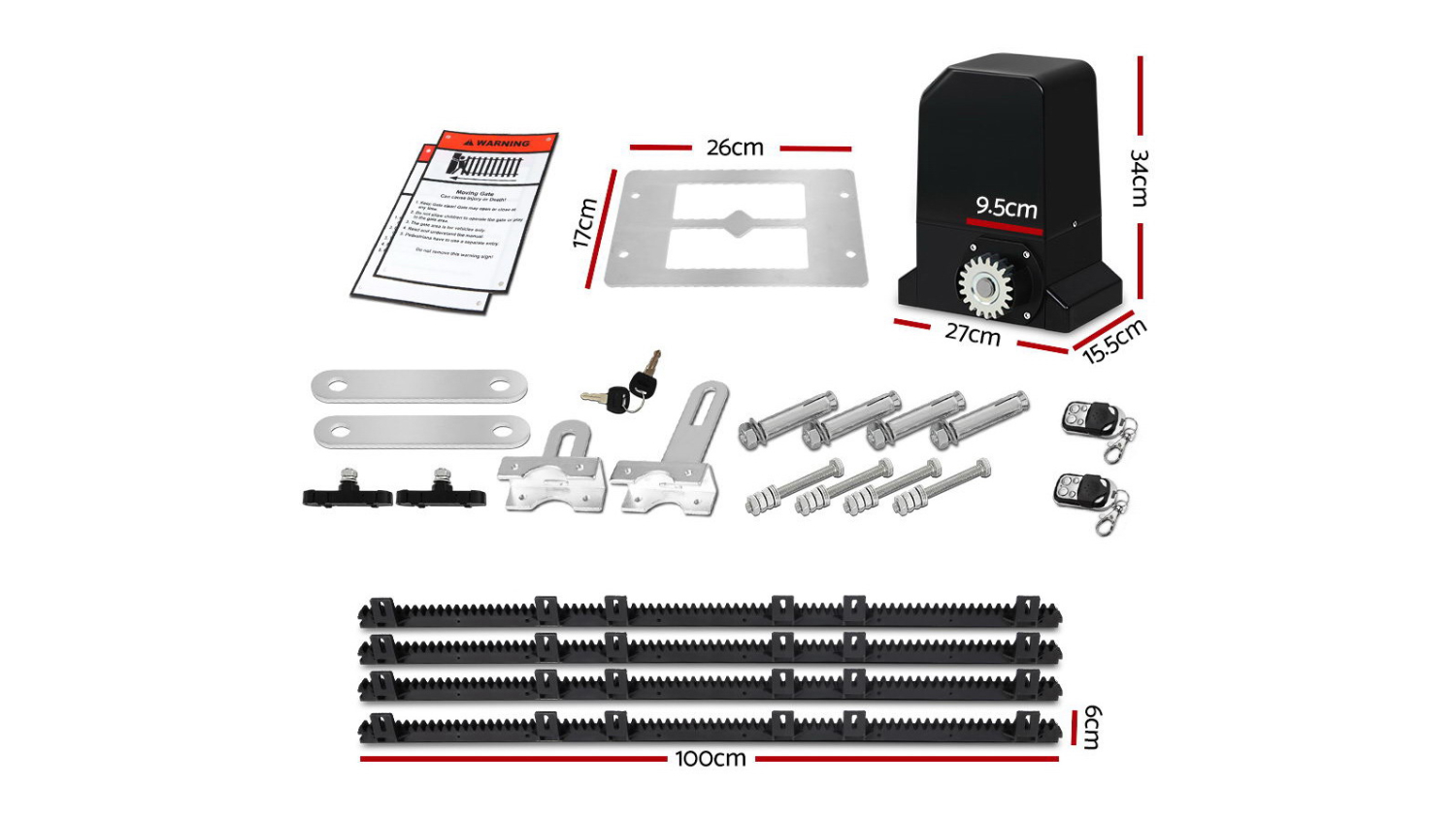 Enhance the security of your property with the convenient Lockmaster Electronic Sliding Gate Opener Kit with Rails. Powered by a heavy-duty 370W 240V AC motor, it can power gates with a maximum weight of 1000kg. Its advanced technology ensures smooth operation, and you can easily adjust the open/close direction. For added safety, it includes an emergency release key, ensuring access even during power outages. Just set the required time for the function to activate the automatic close function and you’ll never worry about an open gate again. Secure your property with the Lockmaster Gate Opener.