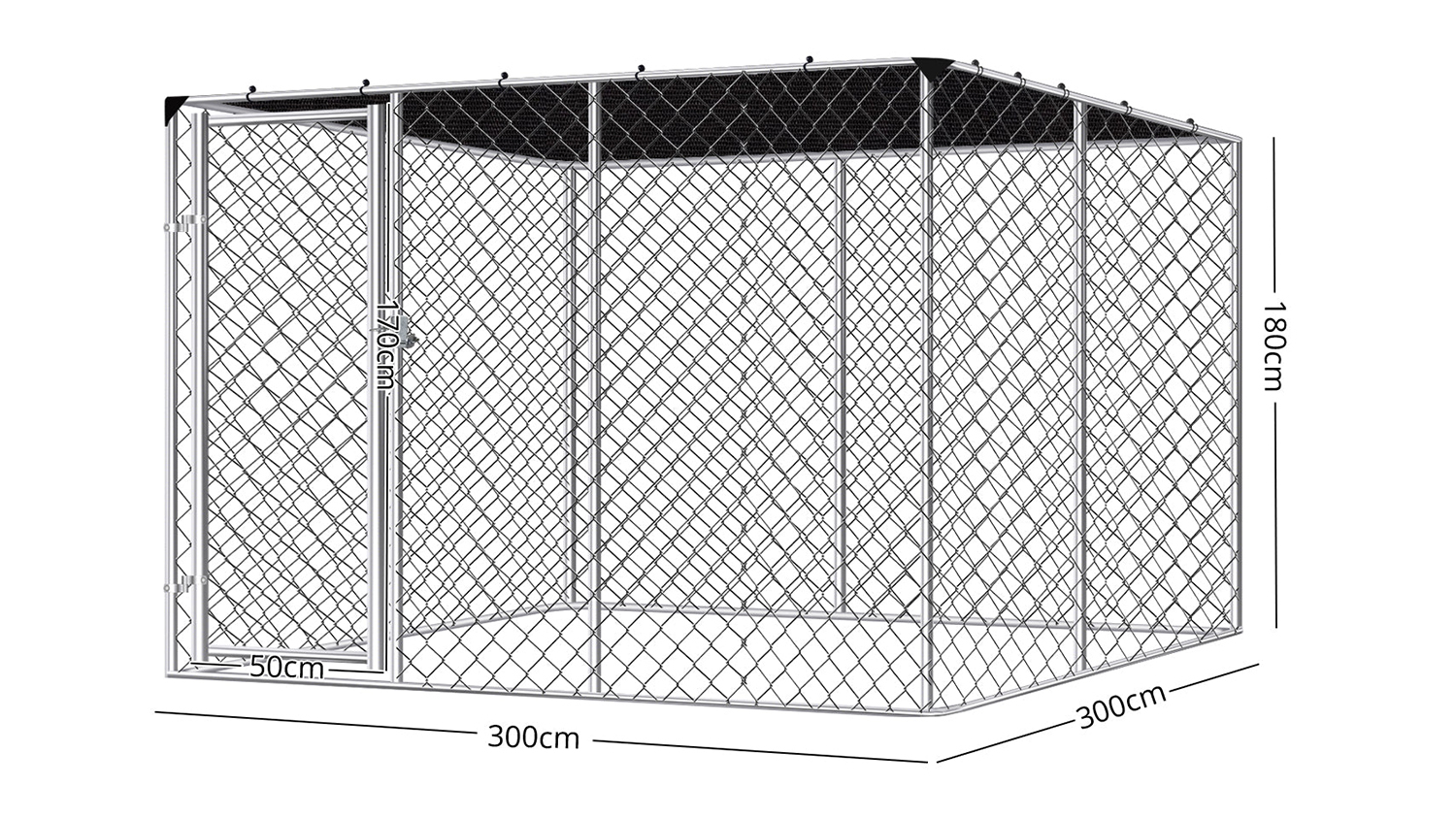 Give your pets a safe and spacious outdoor haven with the TSB Living Dog Run with Shade Sail. This heavy-duty pet kennel is made from sturdy galvanised steel with secure chain link mesh. Perfect for play, exercise, or training, this enclosure features a secure lock system and a bonus shade sail to keep your pets safe, cool, and comfortable.