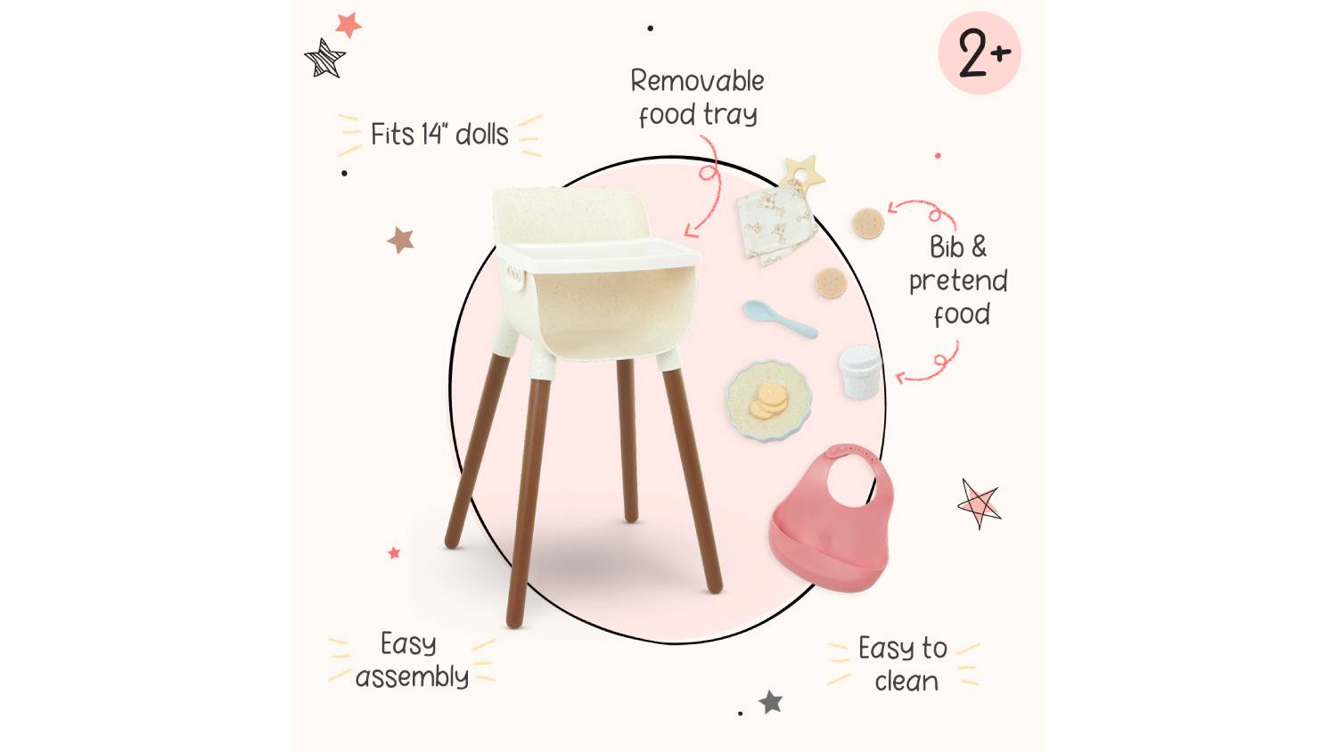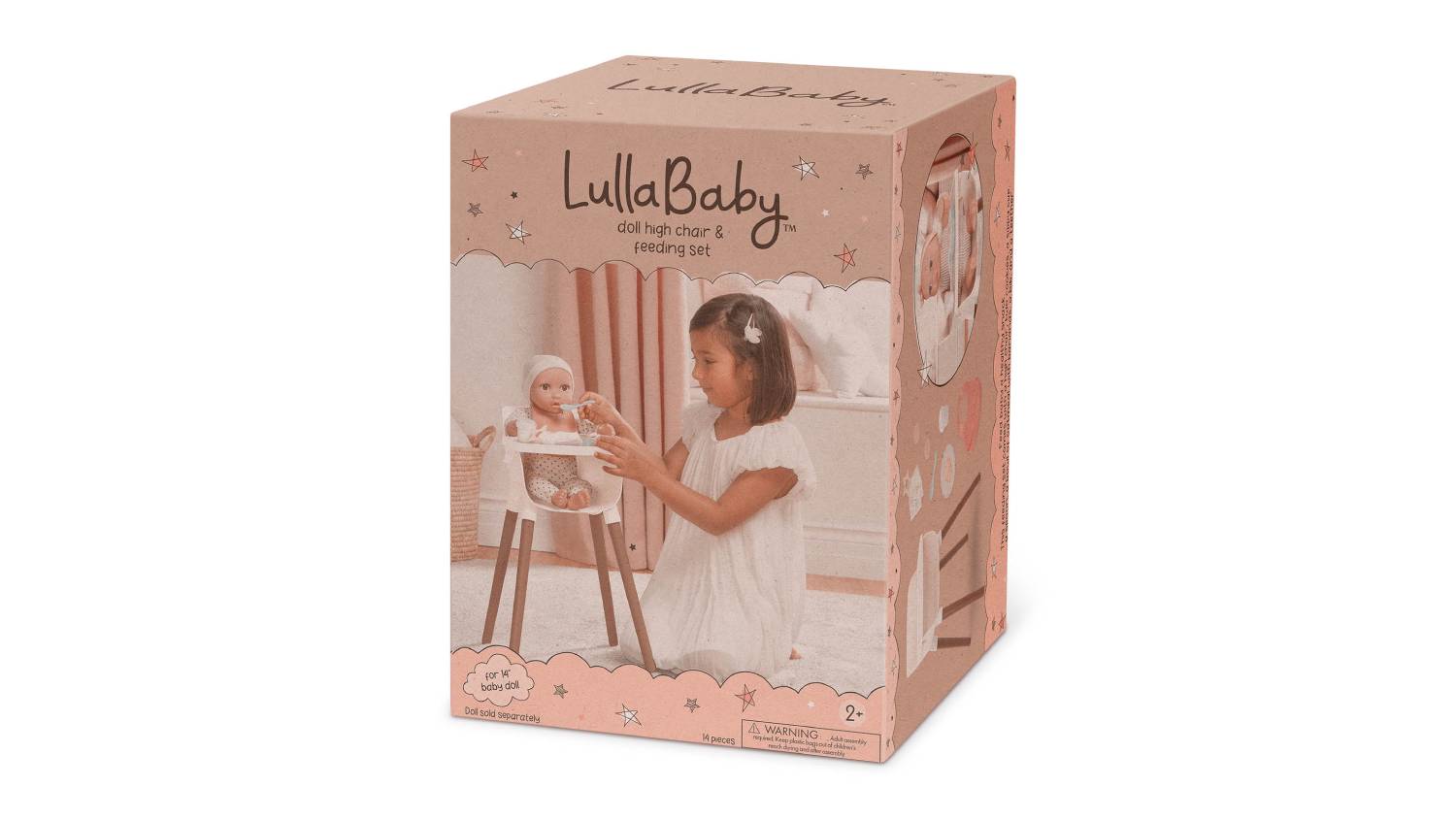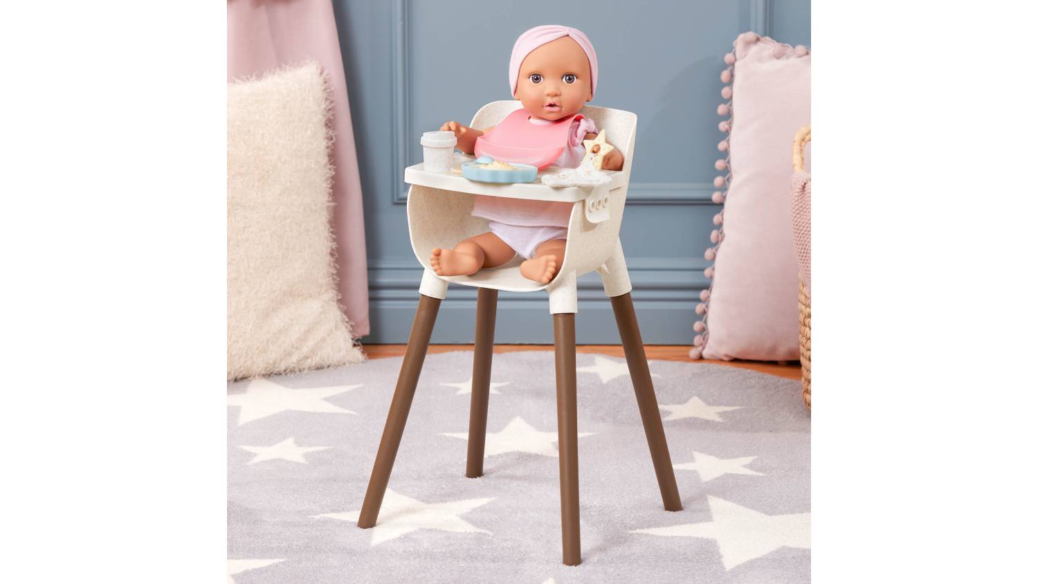 With the LullaBaby Baby Doll High Chair, little ones can feed their favourite doll just like a real parent. This high chair is perfect for little nurturers who love pretend play. With easy setup in two steps and adorable feeding accessories like cookies, a sippy cup, and a bib, kids can enjoy realistic role-play while caring for their baby doll.
