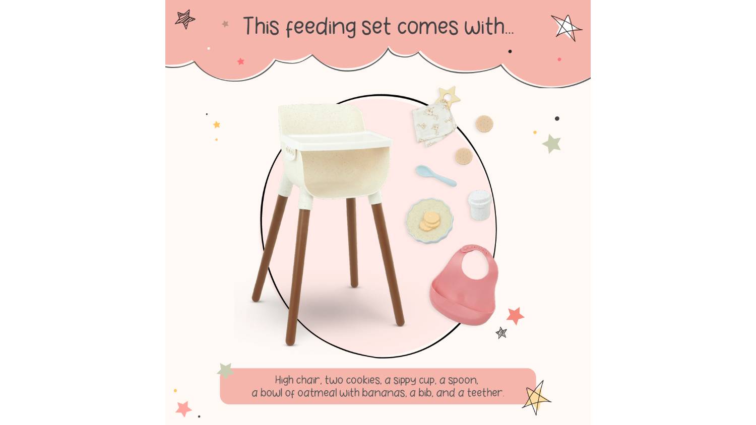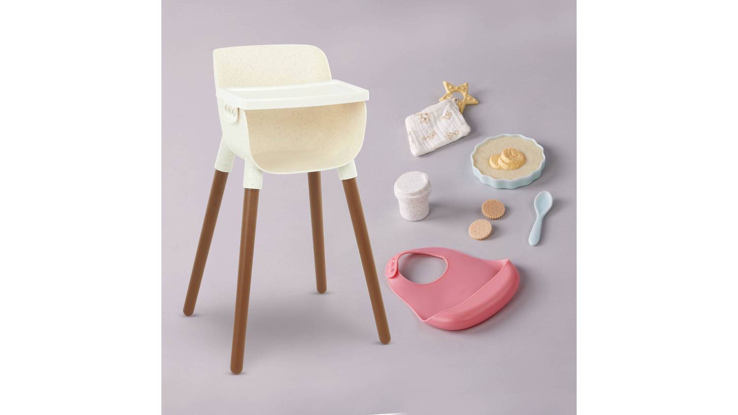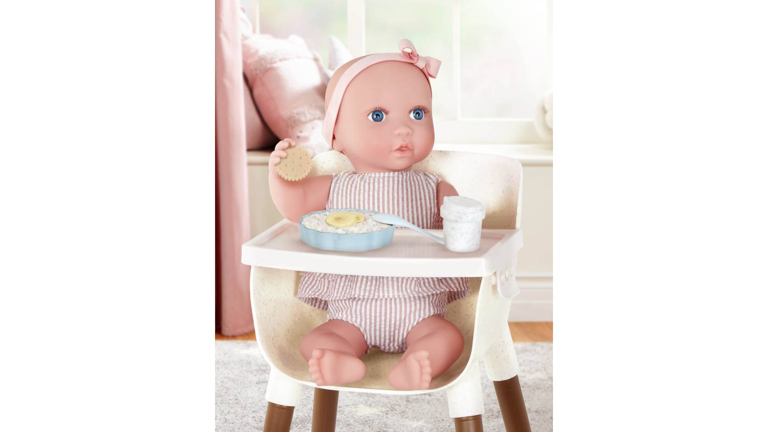 With the LullaBaby Baby Doll High Chair, little ones can feed their favourite doll just like a real parent. This high chair is perfect for little nurturers who love pretend play. With easy setup in two steps and adorable feeding accessories like cookies, a sippy cup, and a bib, kids can enjoy realistic role-play while caring for their baby doll.
