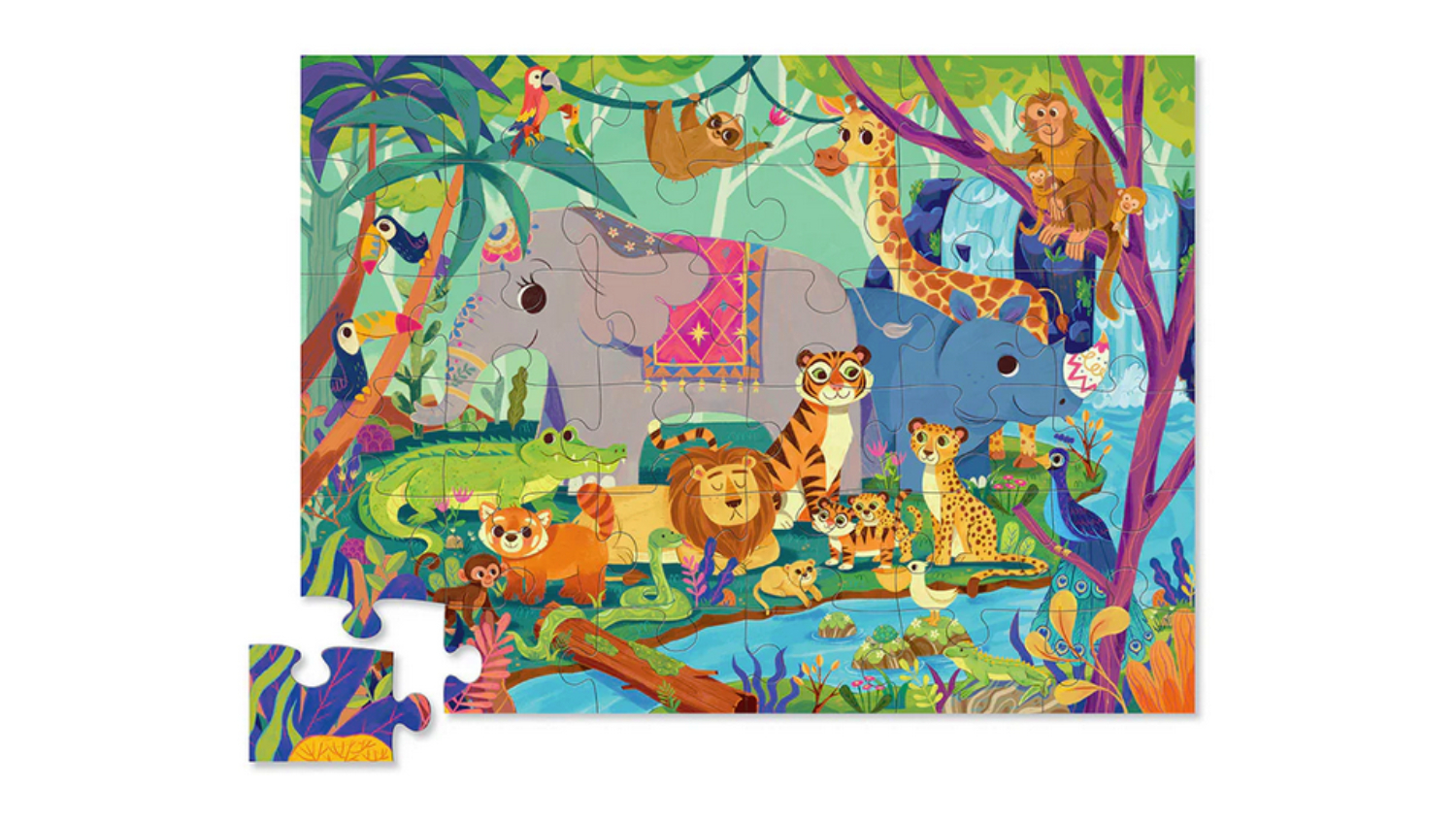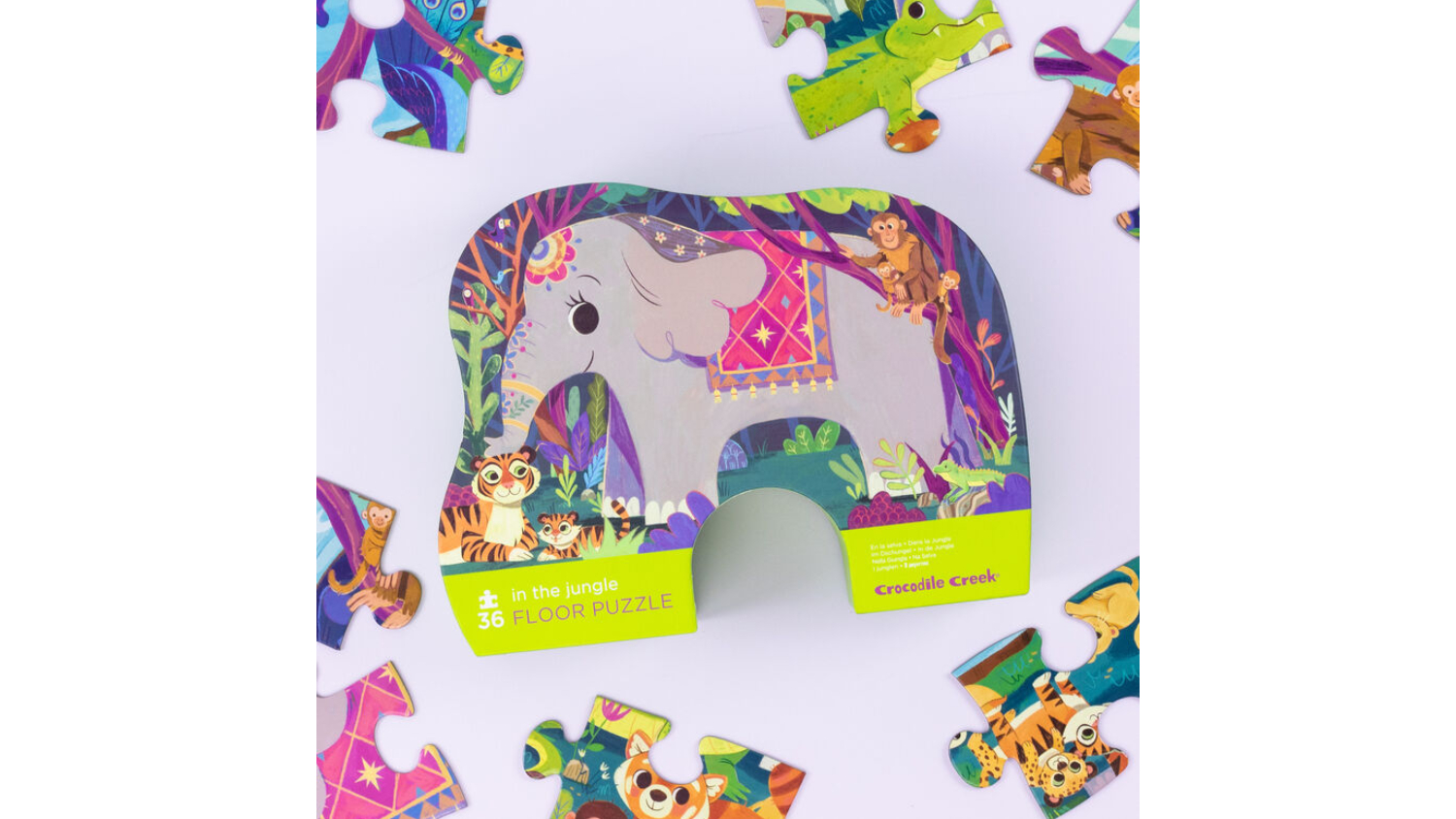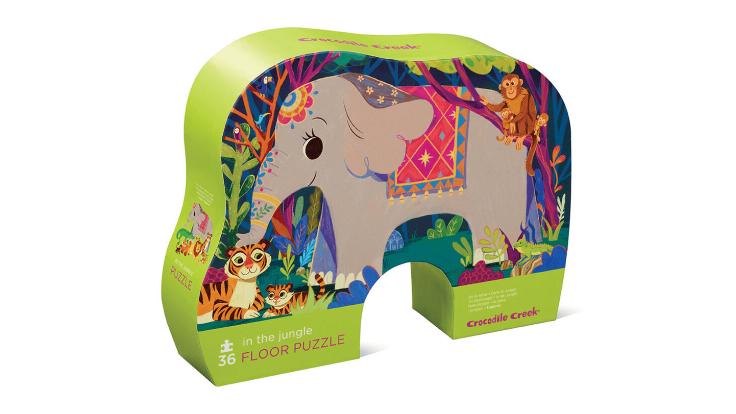 Let your child's imagination run wild with the Crocodile Creek Children's Floor Puzzle! Featuring beautifully illustrated elephants, tigers, and monkeys, this puzzle is a hit for young animal lovers. The jumbo, sturdy pieces are perfect for small hands, while the unique contour-shaped storage box makes cleanup a breeze.