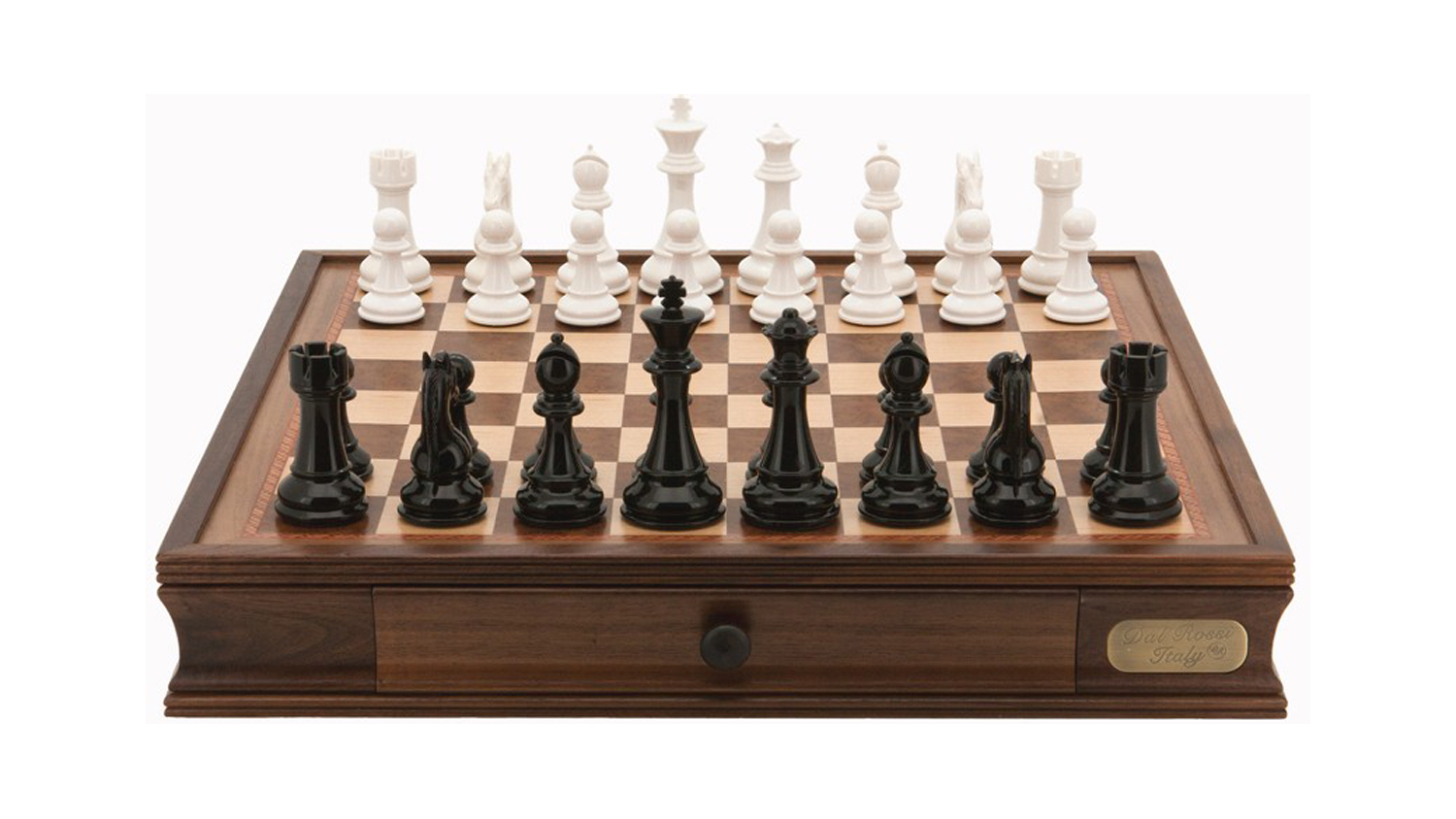 Challenge your friends in a competitive and playful battle using the Dal Rossi 20 Inch Black and White Weighted Chess Set with Drawer. This elegant set features a 20" chess board and includes 32 black and white weighted chess pieces, each standing at 101mm. The built-in drawer also offers convenient storage. Ideal for both serious players and collectors, this set brings sophistication and elegance to any chess match!