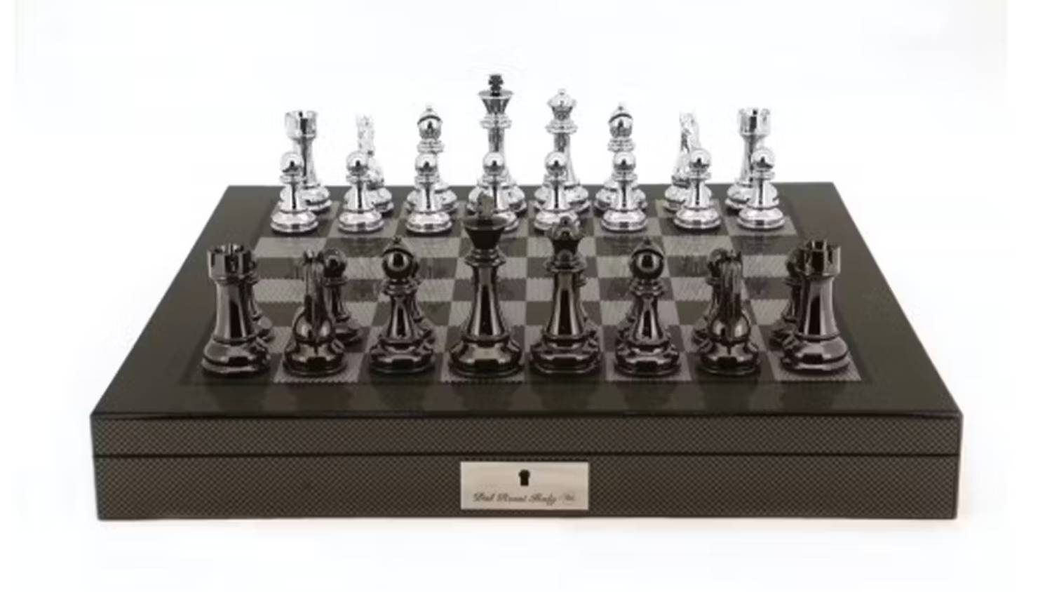 Put your strategy skills to the test and have fun playing with the Dal Rossi 20-inch Silver and Titanium Chess Set! This nifty game includes a 20" board and two sets of 16 chessmen. It also showcases a carbon fibre finish and includes built-in storage compartments for chess pieces. Master each piece's unique moves to outwit your opponent and win checkmate!