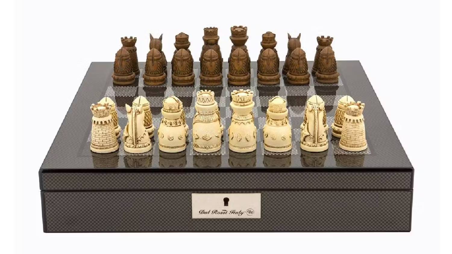 Indulge in a game of strategy and style with the Dal Rossi 16" Medieval Chess Set! This luxurious chess set features a carbon fibre shiny finish and medieval-themed resin chessmen that are both striking and elegant. Plus, you'll find built-in compartments, ensuring each chess piece is securely stored. Immerse yourself in the thrill of strategic gameplay and command your army to victory!