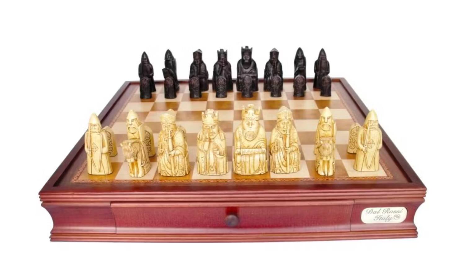 Experience the thrill of strategic warfare with the Dal Rossi 20" Isle Of Lewis Chess Set with Drawers! With a generous 20" size and built-in drawers, this chess set is an iconic addition to your board game collection. Prepare to engage in epic battles of wit and strategy as you move your pieces across the chessboard.