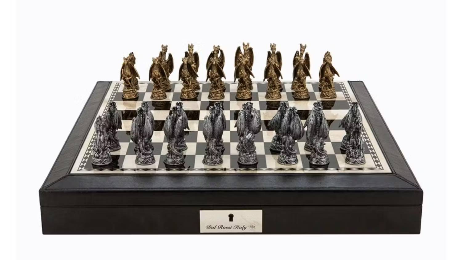 Take your matches to the next level with the Dal Rossi 18" Dragon Pewter Chess Set. Immerse yourself in a world where artistry meets strategy, and let the beauty of this exquisite chess set inspire your every move. This nifty set includes a Dal Rossi chessboard and built-in drawers for convenient storage. Master each piece's unique moves to outwit your opponent and win checkmate!