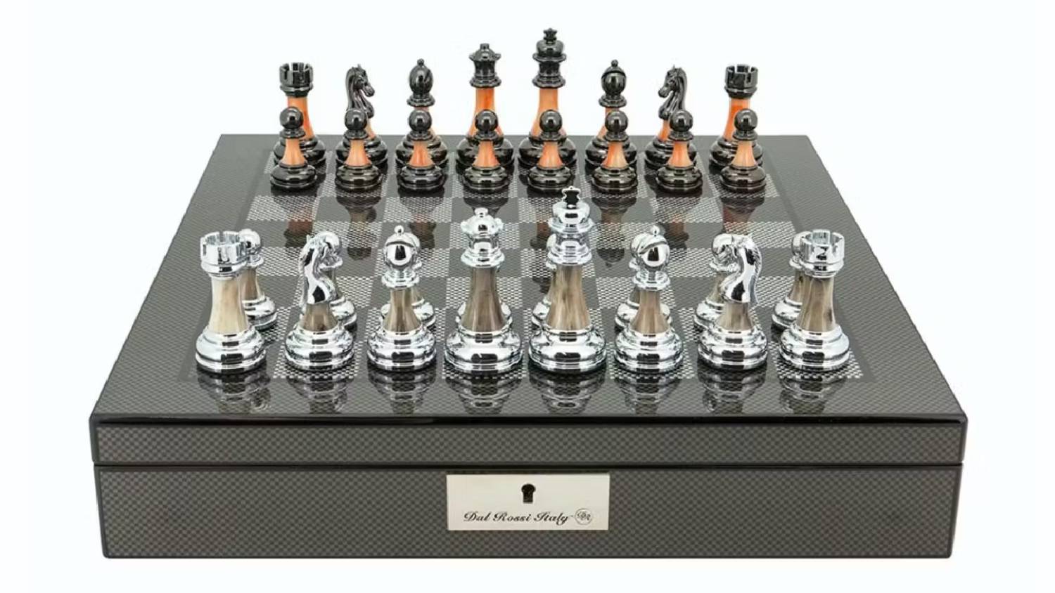 Play in style with the Dal Rossi 16" Staunton Metal/Marble Chess Set. Crafted with meticulous attention to detail, this sleek chess set is a testament to elegance and quality. Whether you're a chess enthusiast or a lover of fine craftsmanship, this set will be a cherished addition to your board game collection. Master each piece's unique moves to outwit your opponent and win checkmate!