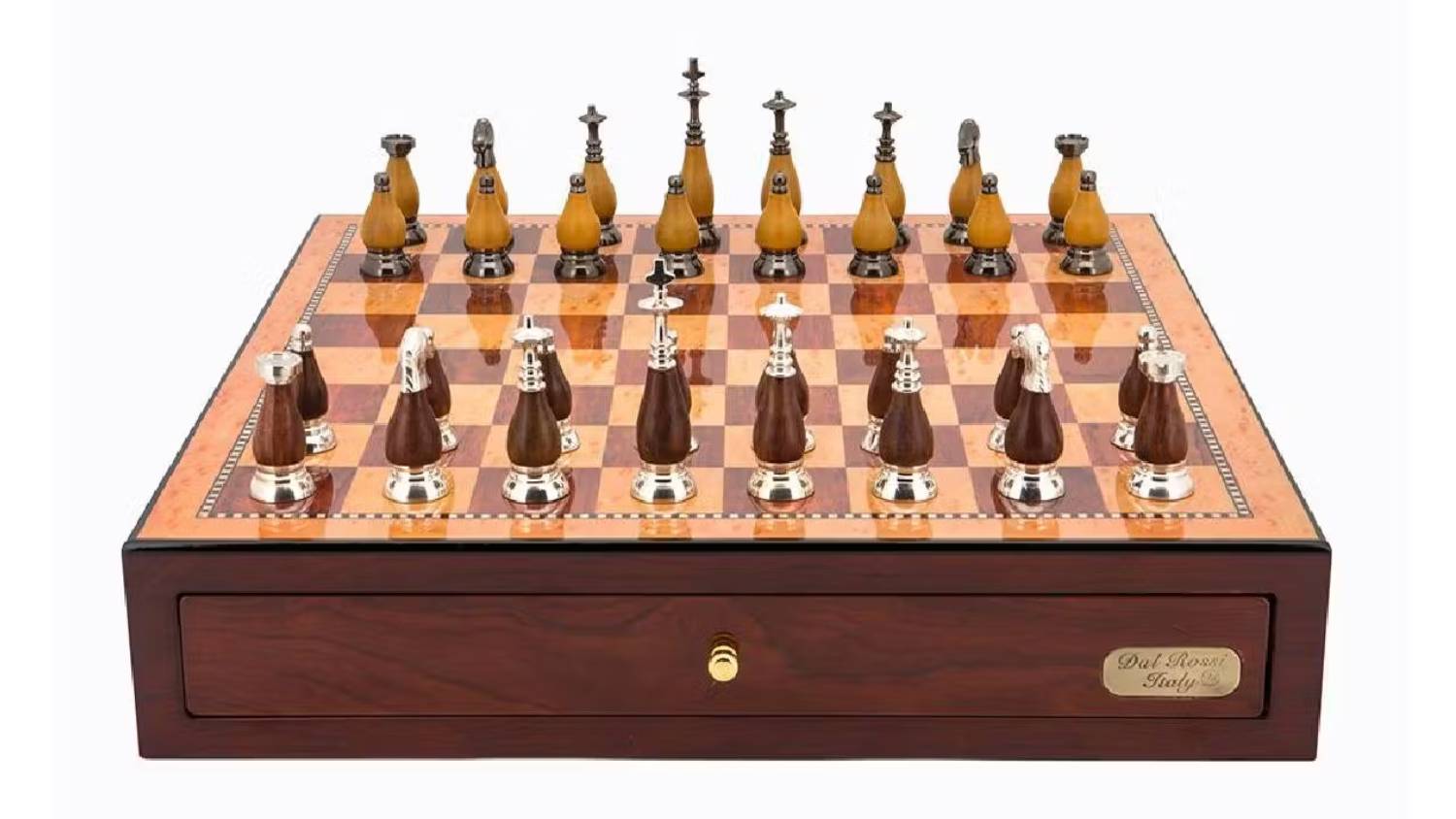 Play in style with the Dal Rossi 18" Staunton Metal/Wood Chess Set. The chess box is crafted from a rich red mahogany finish and features a nifty compartment for storage. The chessmen are the highlight of this set, featuring a combination of Staunton metal and wood finish that exudes luxury. Master each piece's unique moves to outwit your opponent and win checkmate!