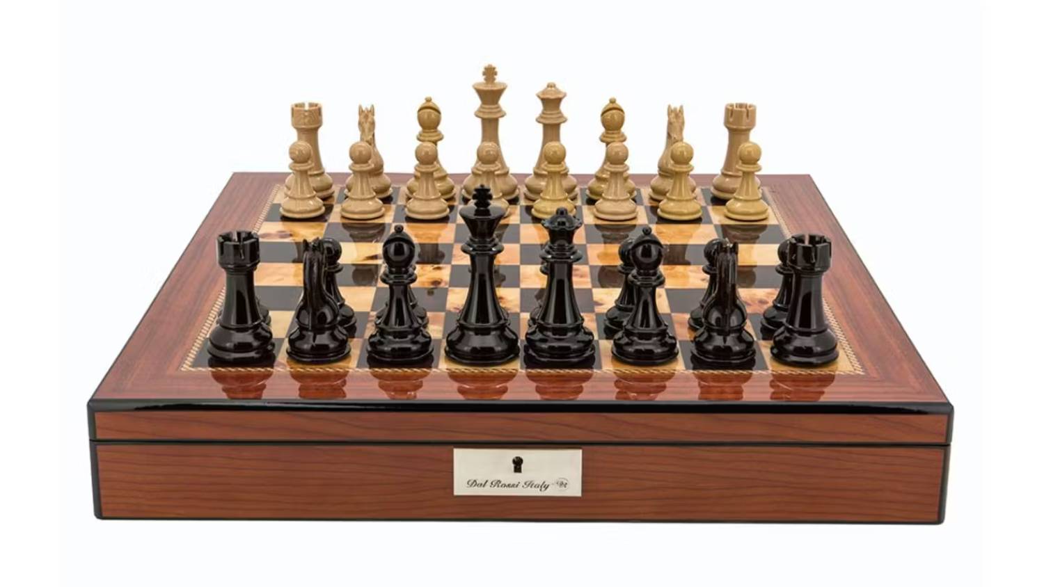 Indulge in the beauty of classic design and the thrill of strategic battles with the Dal Rossi 20" Dark Cherry and Box Wood Chess Set! This set is a true testament to elegance and craftsmanship. Master each piece's unique moves to outwit your opponent and win checkmate!