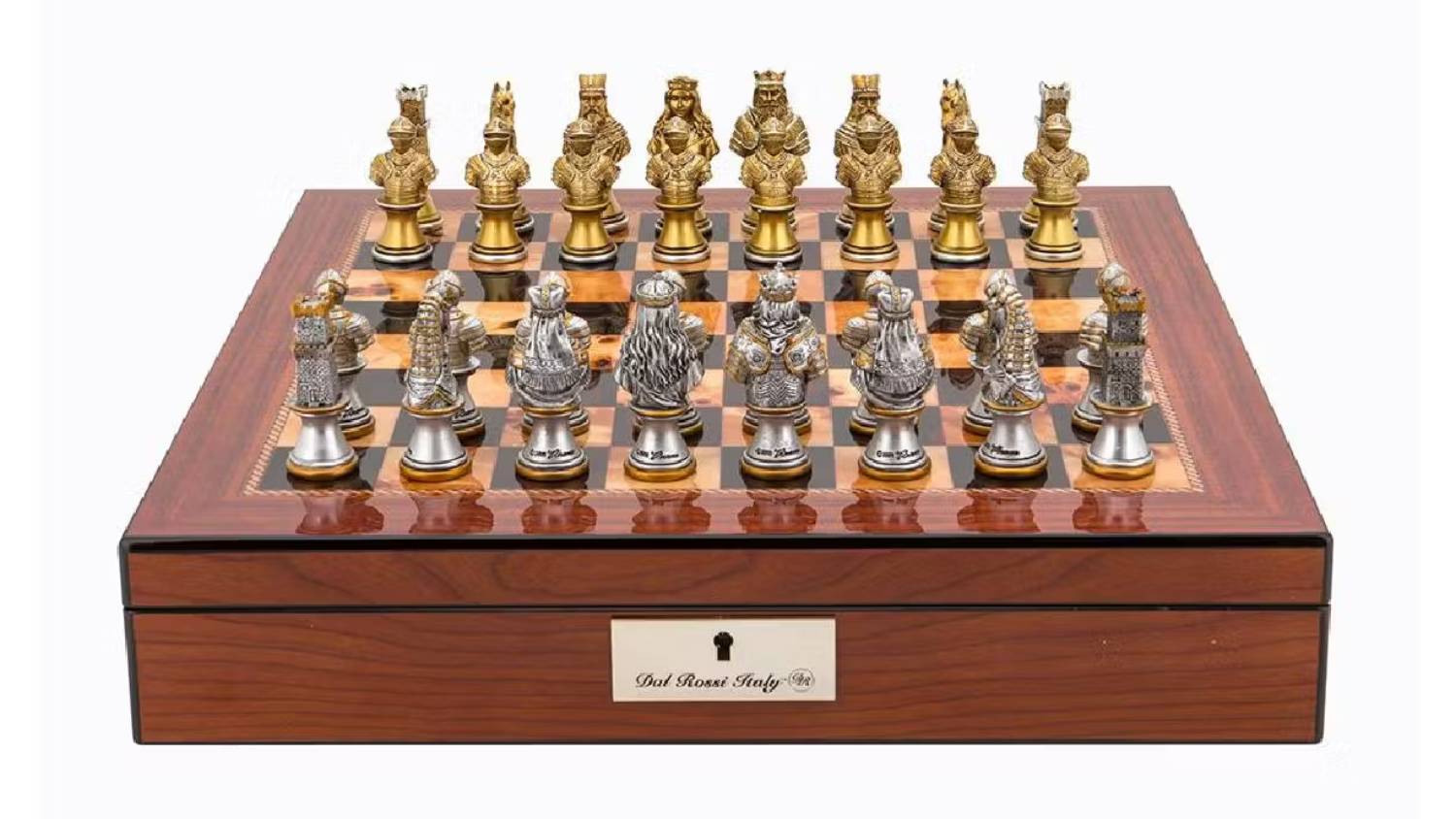 Enjoy the thrill of strategic play and the beauty of fine craftsmanship with the Dal Rossi 16" Medieval Warrior Chess Set! Encased in a stunning walnut finish box with lock and featuring detailed medieval warrior resin pieces, this set offers a luxurious vibe. Moreover, it has built-in drawers, so you can keep all components safe and sound when the battle is over.