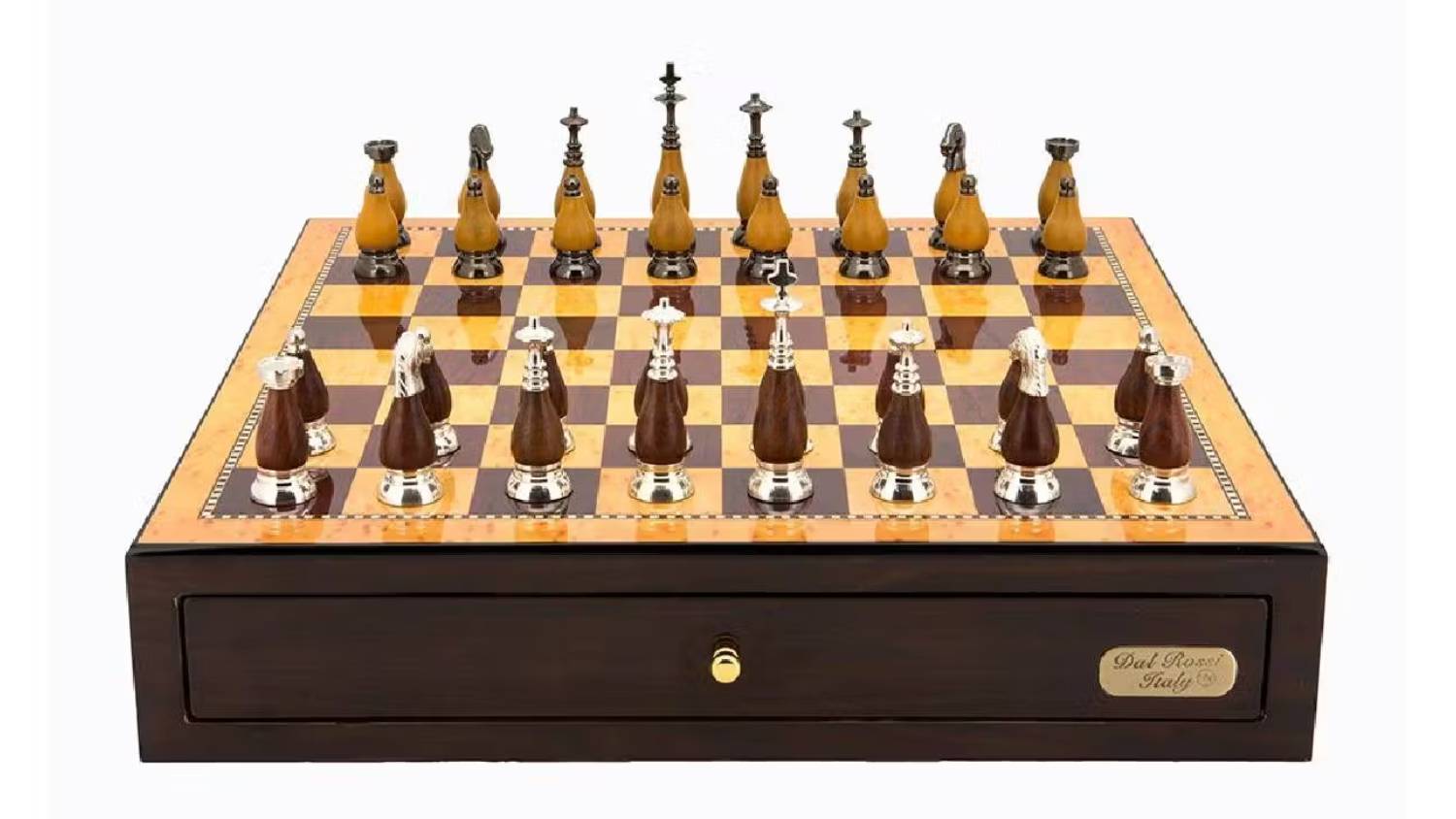 Play in style with the Dal Rossi 18" Staunton Metal/Wood Chess Set. The chess box is crafted from a rich walnut finish and features a nifty compartment for storage. The chessmen are the highlight of this set, featuring a combination of Staunton metal and wood finish that exudes luxury. Master each piece's unique moves to outwit your opponent and win checkmate!