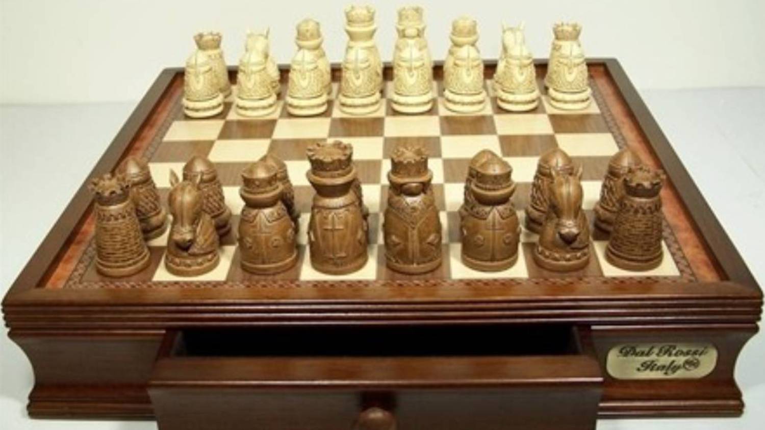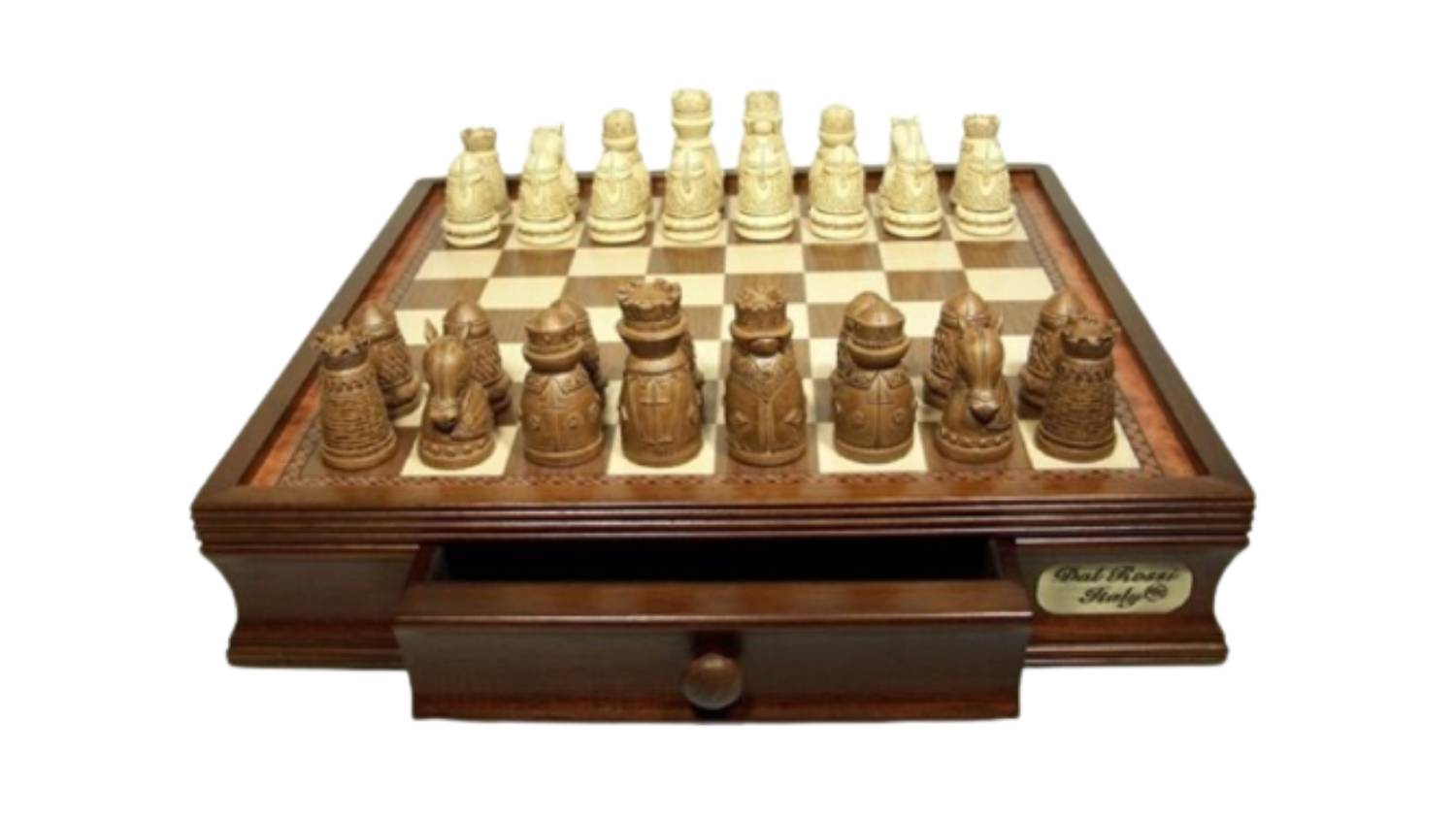 This exquisite Dal Rossi 16" Medieval Chess Set brings the spirit of ancient battles to your tabletop. Made with a sleek poly resin finish and packed with intricately crafted chess pieces, this set lets you unleash your strategic thinking and wits. Moreover, it has built-in drawers, so you can keep all components safe and sound when the battle is over. Immerse yourself in the thrill of strategic gameplay and command your army to victory!