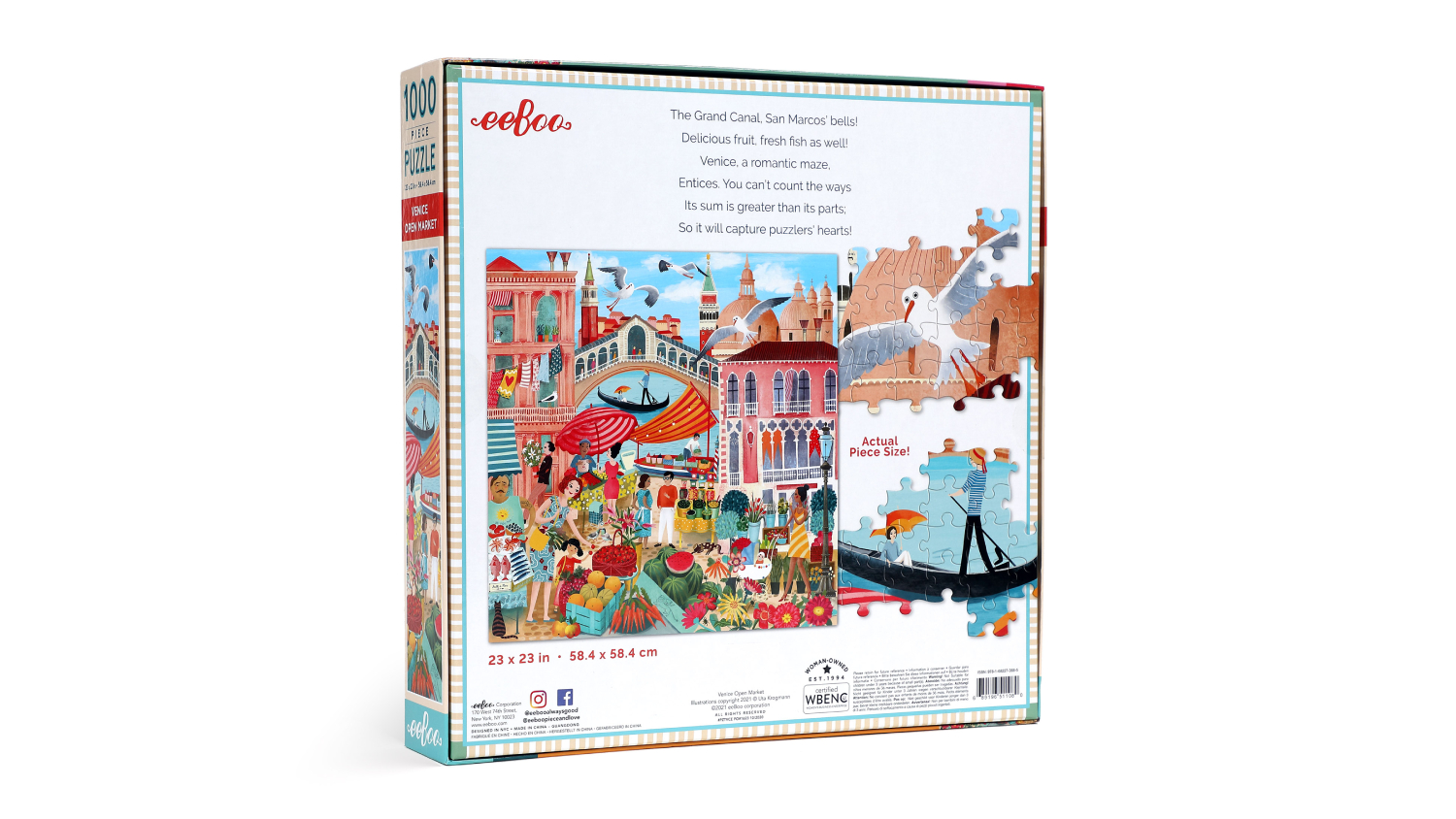 Unwind as you piece together the eeBoo Square Jigsaw Puzzle 1000pcs. This engaging activity offers hours of relaxation and mental stimulation. Featuring an illustrated Venician Open Market, it delivers a fresh and captivating visual experience. It’s a must-have for any puzzle enthusiast!