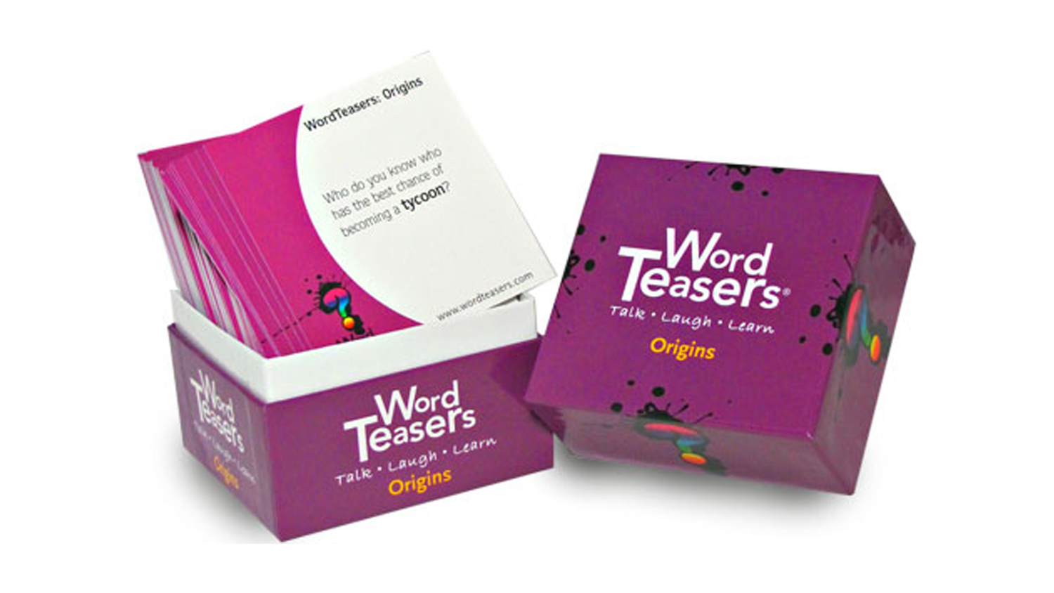 Enrich your vocabulary and learn something new with the Word Teasers Origins! This set of 150 cards delves into English words and phrases with roots in other languages. Each card in the purple box includes the origin, definition, and a quirky fact, making it a fun and educational way to start conversations.
