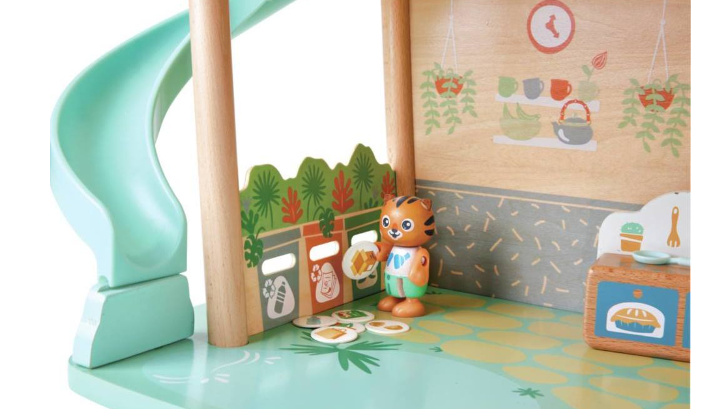 The Hape Green Planet Tiger's Jungle House Playset is your passport to a world of wild fun. This adorable set lets your little explorer create imaginative adventures. Check out the wonderful tiger family and their colourful jungle house with various accessories, a pond, and a slide! It's the perfect way to learn about sustainable environmental practices like waste sorting and recycling.