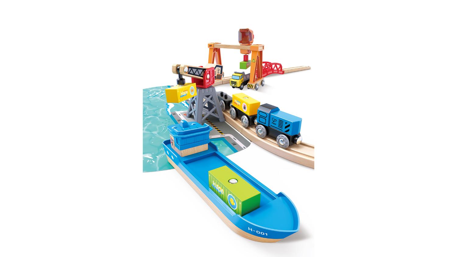 The Hape Lift & Load Harbor Railway lets kids explore sea and rail transport in a fun and interactive way! This set features a crane to load cargo between the ship and train, a cargo ship, trailers, cargo blocks, tracks and more to build a bustling port. It's perfect for encouraging imaginative play and teaching children about different modes of transportation.