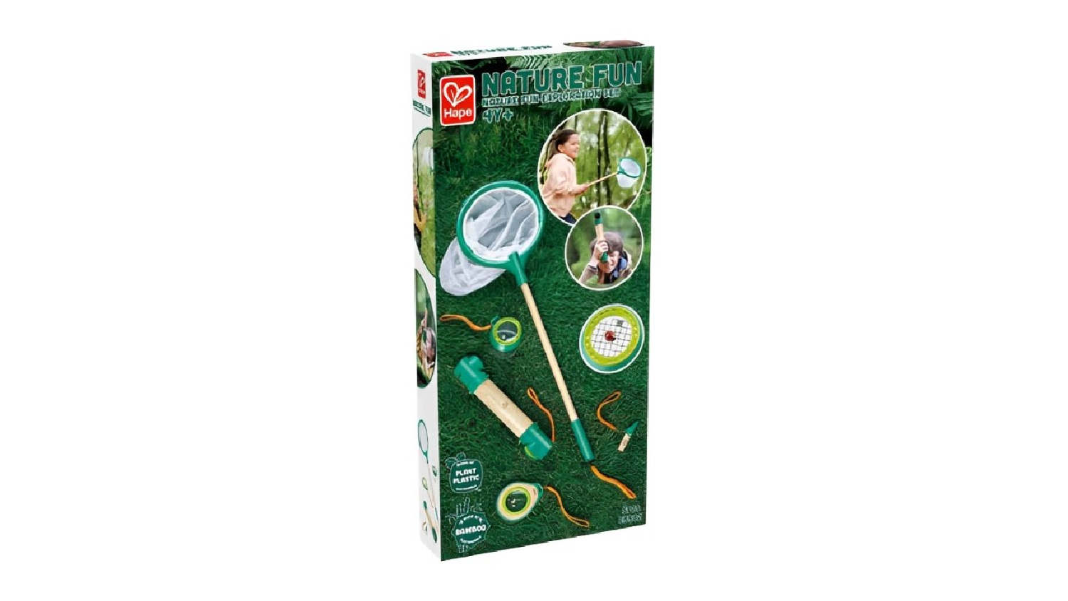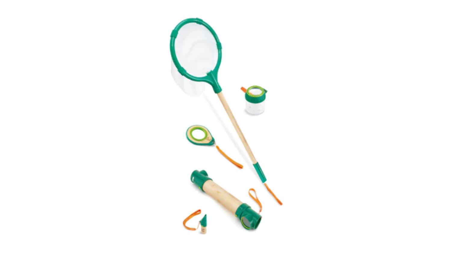 Spark a love for environmental exploration with the Hape "Nature Fun" Complete Exploration Set 5pcs.! Kids can gather insects with the 70cm net, then pop them into the observation cup and inspect them with the magnifying glass before setting them free. Your little explorer can also use the handy whistle to call for friends or spy on wildlife with the periscope. Each element is made of sustainable bamboo and plant-based plastic.