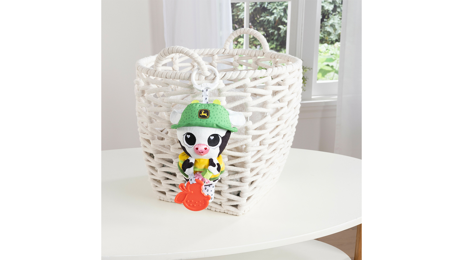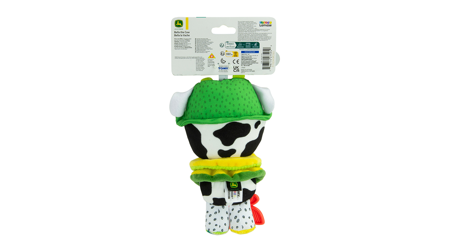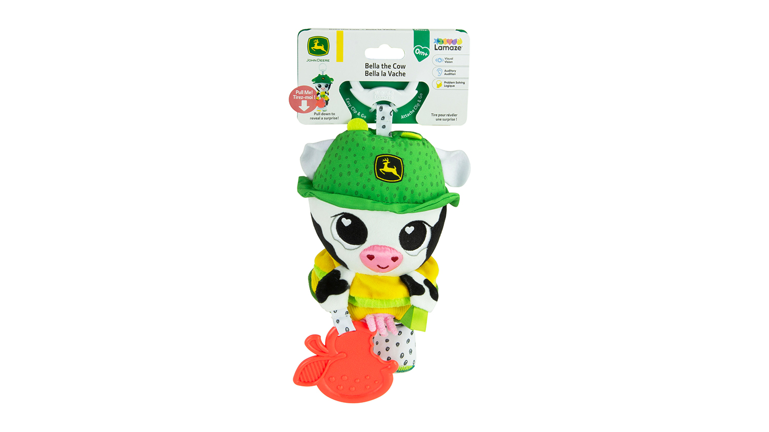 Moo-ve into fun with the John Deere’s KIDS Lamaze Clip 'N' Go Plush Bella The Cow. This fun developmental toy features engaging textures, crinkling sounds, and a chewy apple to make playtime exciting. The convenient clip lets you bring Bella along for on-the-go fun. Pull Bella’s legs down for a delightful surprise!