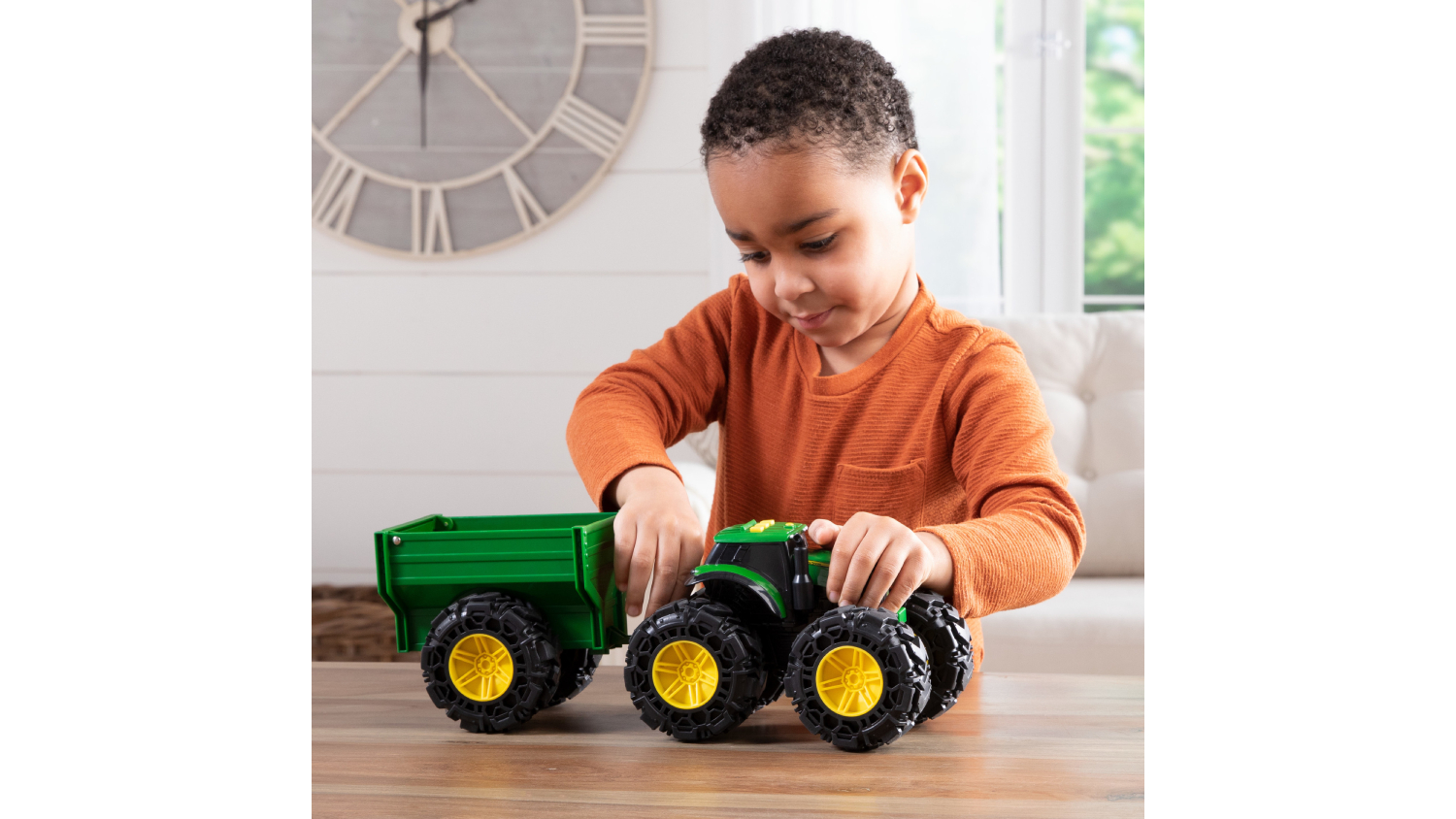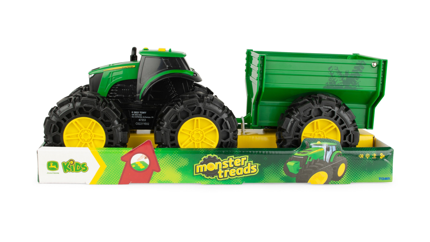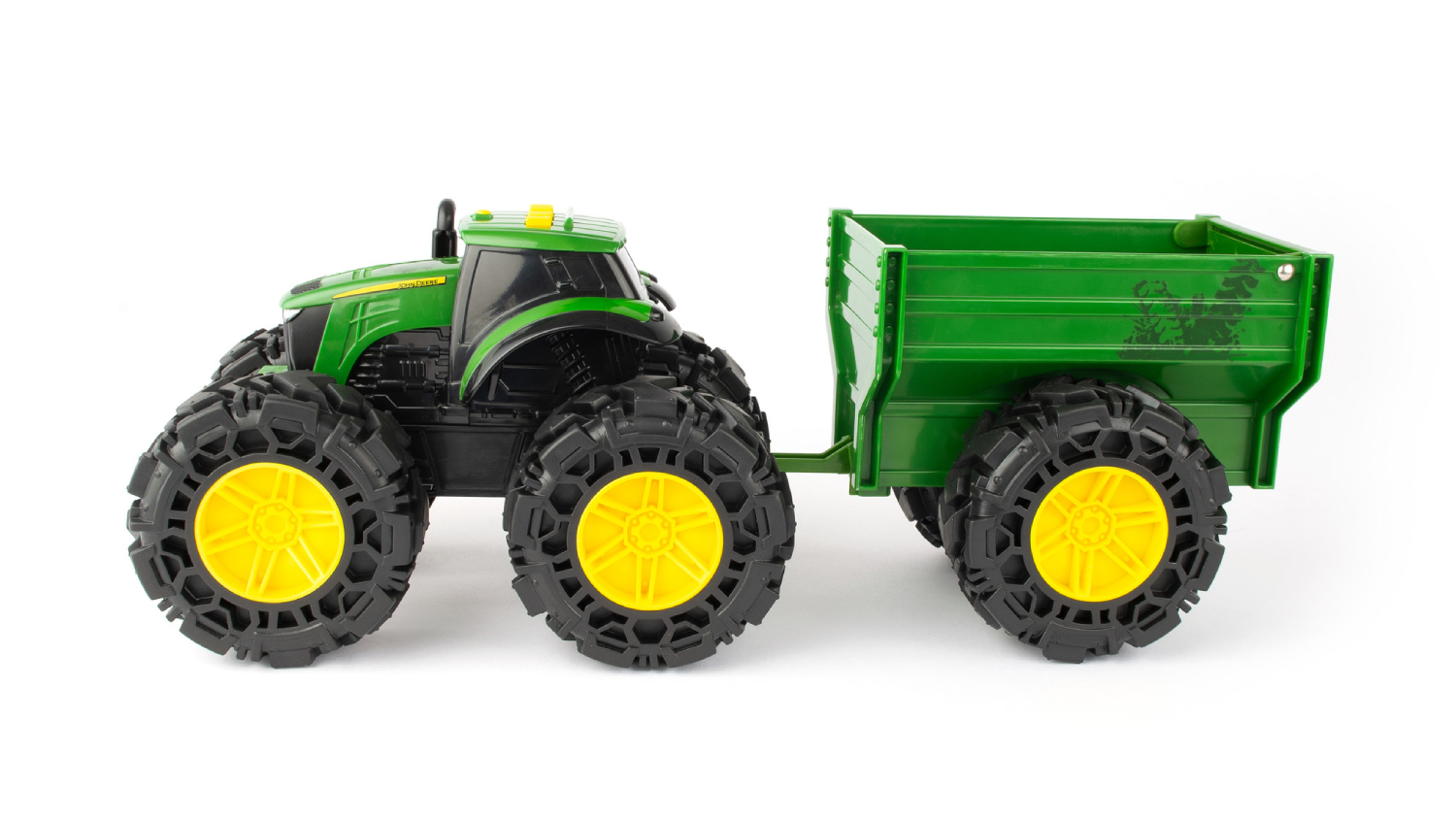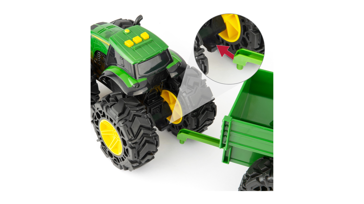 Make imaginative play more exciting than ever with the John Deere Kids Monster Treads Tractor & Trailer Toy Set! Featuring a detachable wagon, an easy-to-open rear door, improved tyres, cool lights, and fun sounds, this set is ready to fuel your pretend-play adventures. It also measures over 38cm long with the wagon attached, perfect for hours of indoor or outdoor fun.