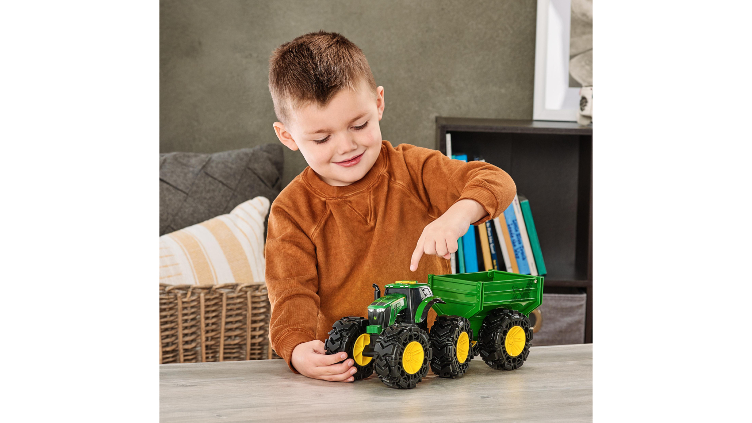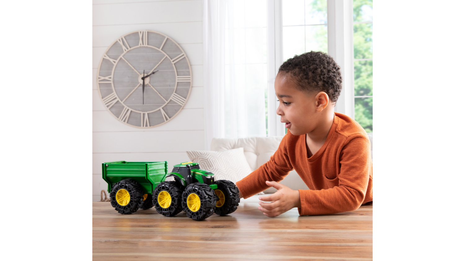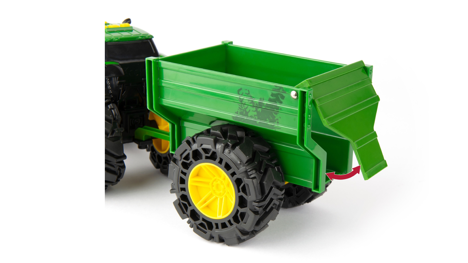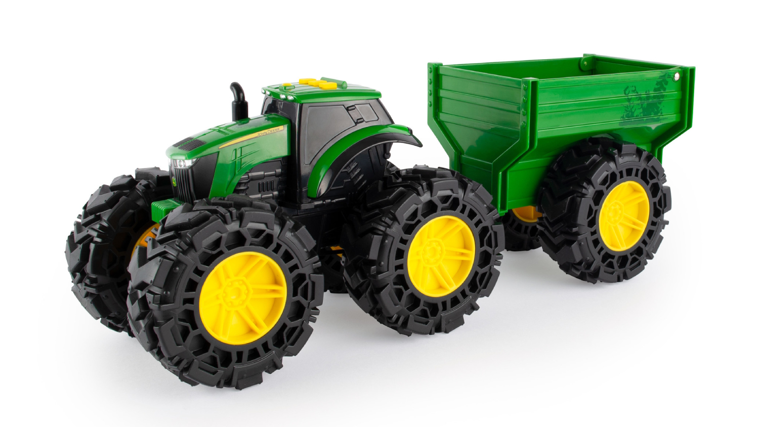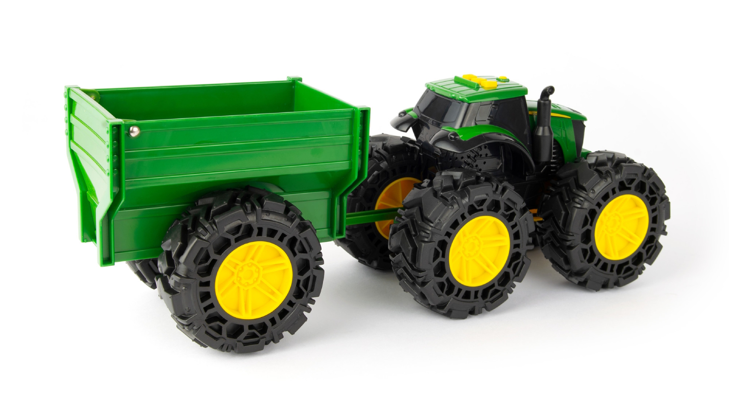 Make imaginative play more exciting than ever with the John Deere Kids Monster Treads Tractor & Trailer Toy Set! Featuring a detachable wagon, an easy-to-open rear door, improved tyres, cool lights, and fun sounds, this set is ready to fuel your pretend-play adventures. It also measures over 38cm long with the wagon attached, perfect for hours of indoor or outdoor fun.
