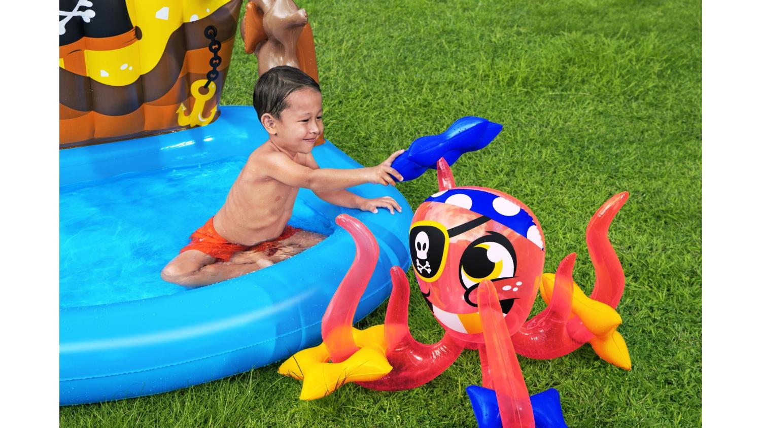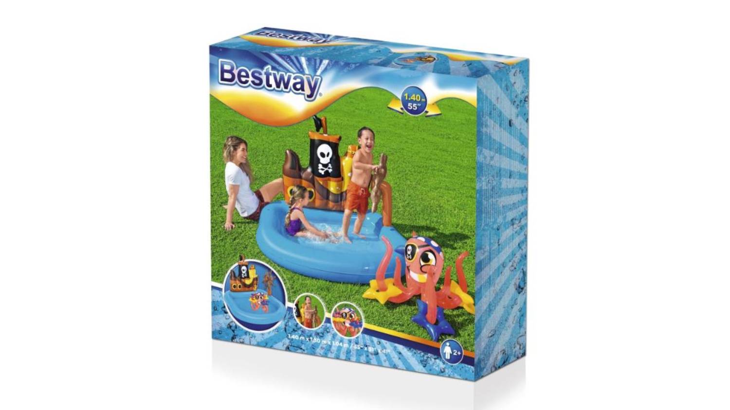 Set sail in your backyard with the Bestway Inflatable Wading Pool Ships Ahoy! Measuring 1.4 x 1.3 x 1.04m, this inflatable pool transforms your outdoor space into a sea of imagination, inviting your little ones to embark on a thrilling voyage. It features a steering wheel, inflatable octopus, and 4 rings, creating a lively ring toss game that not only entertains but also aids in developing motor skills and hand-eye coordination.